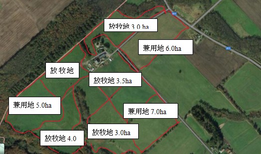 家族経営であり2世帯で運営しています。放牧地は平坦地と丘陵地にあり、小牧区と中牧区の組み合わせ利用です。兼用地は1番収穫後からの利用(7月以降)と2番草収穫後(9月以降)利用でいずれも大牧区利用です。また育成牛専用放牧地は丘陵地にあります。植生状態によって小牧区と中牧区を柔軟に活用して効率利用に努めています。兼用地は夏から秋にかけて放牧草の衰退期に大牧区として利用します。昼夜放牧です。