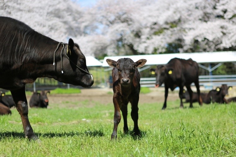 ほ乳子牛を母牛につけたまま放牧します。