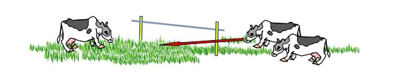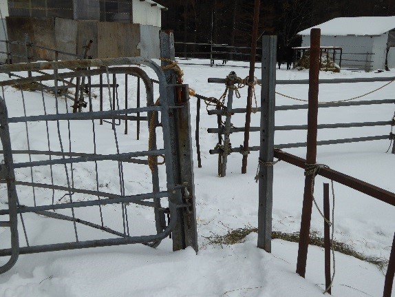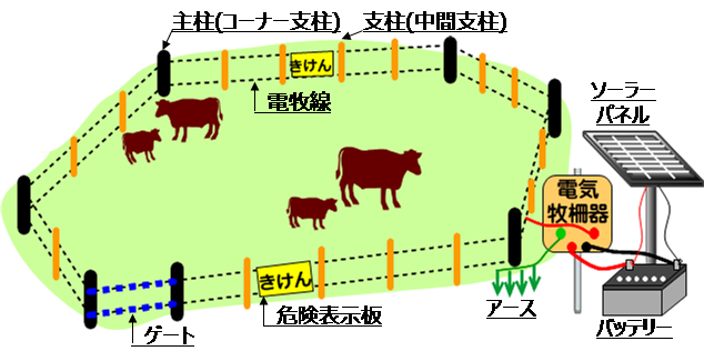 外柵は脱柵、野生動物の侵入を防ぐために十分な強度が必要です。張力を緩めて倒伏させることができるタイプの高張力線は、降雪時や作業機を入れるときに便利です。簡易な電気柵は物理的な強度はなく、電気ショックを嫌う心理柵です。事前に牛に電気柵に慣れさせてから放牧します。また、通電していないことがわかると、簡単に脱柵するので、漏電がないように日頃から確認します。スプリングゲートは長さの異なる出入り口に利用できて便利です。牧区の出入口の場所は牛の移動の労力に大きく影響します。動線をよく考えましょう。