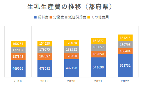 農林水産省が公表(2023)している近年の酪農経営の生産費用について整理すると表のような内容になります。搾乳牛1頭当たりで示しました。北海道と都府県でその構成内容にはやや相違が見られますが、共通しているのは飼料費が最大費用であることです。次に減価償却費と労働費が続きます。この3費用が酪農経営の最大費用であり、生産費用全体を大きく左右しているといえます。