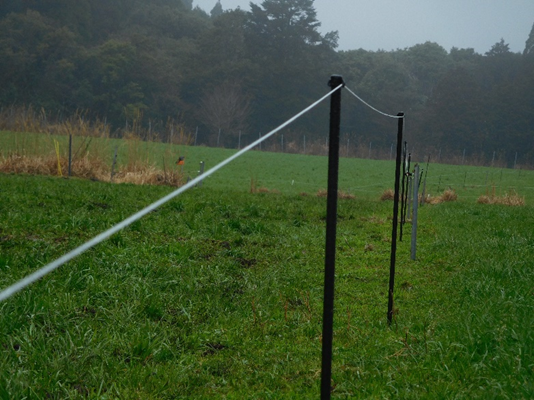 牧場の境界線には牛の脱走や野生動物侵入防止の丈夫な外柵を、放牧地内は移動が容易な簡易な電気牧柵を利用します。