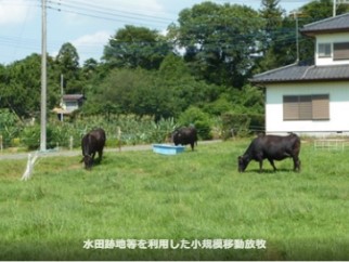 水田を利用する放牧です。牧草種子をまいて草地化して放牧するほか、飼料イネを立毛状態で放牧利用することもあります。