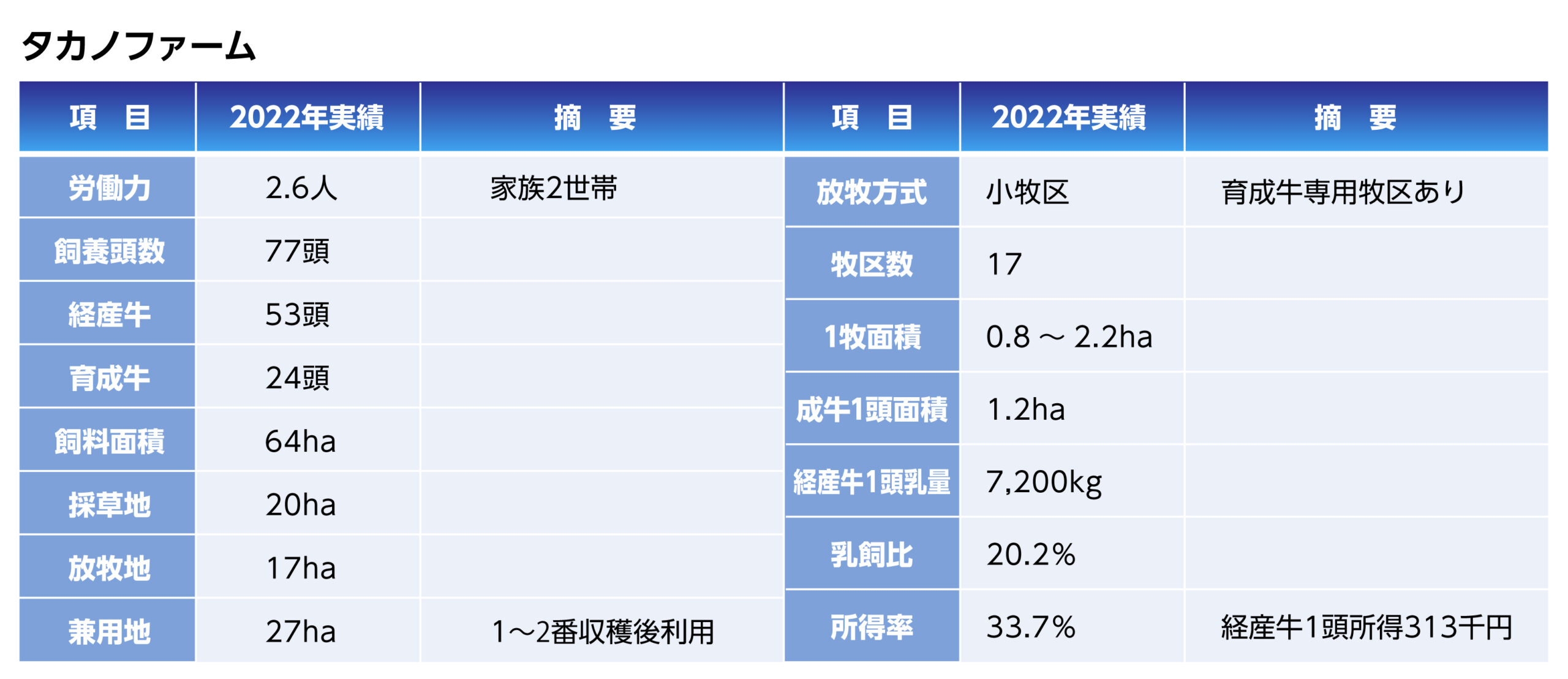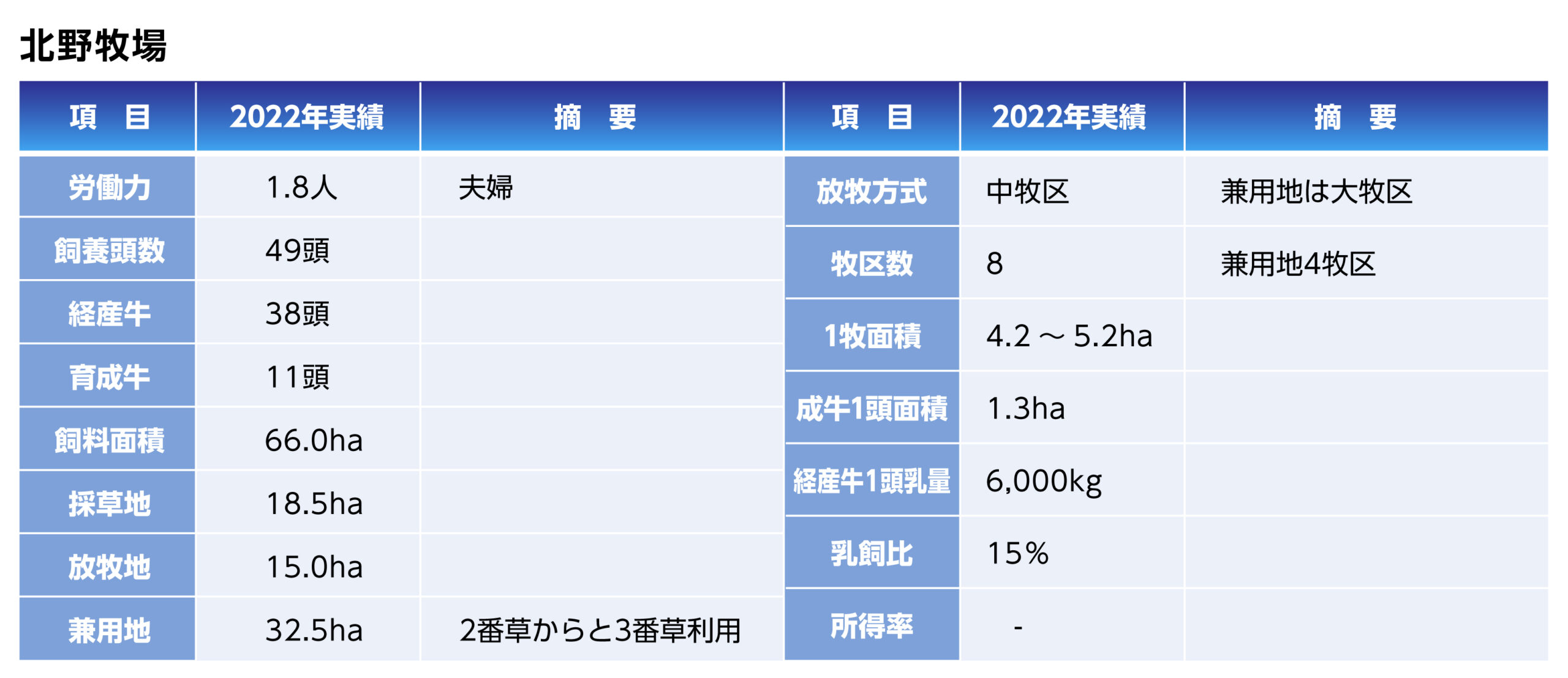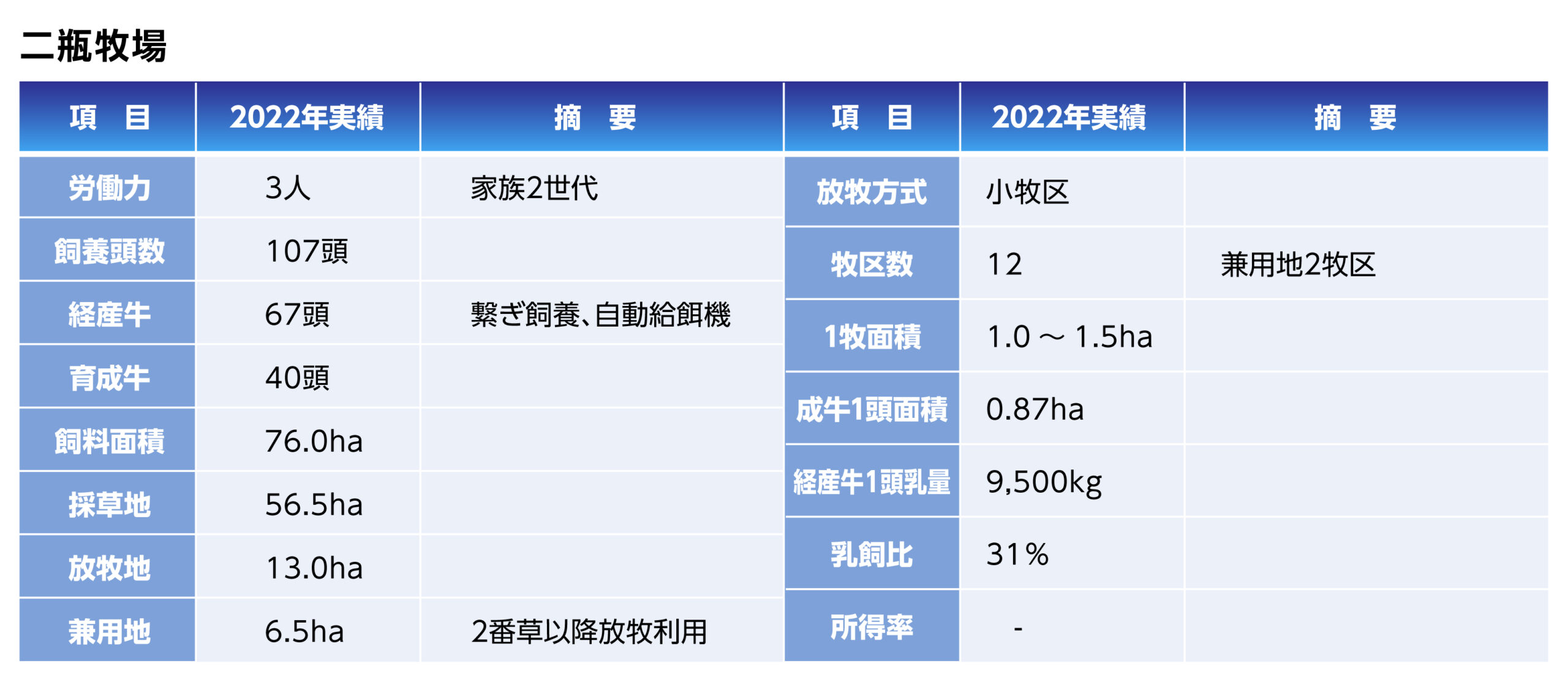 飼養規模は80頭前後で経産牛は53頭で推移しています。放牧専用地は17ha、兼用地27haとして兼用利用を多くしています。