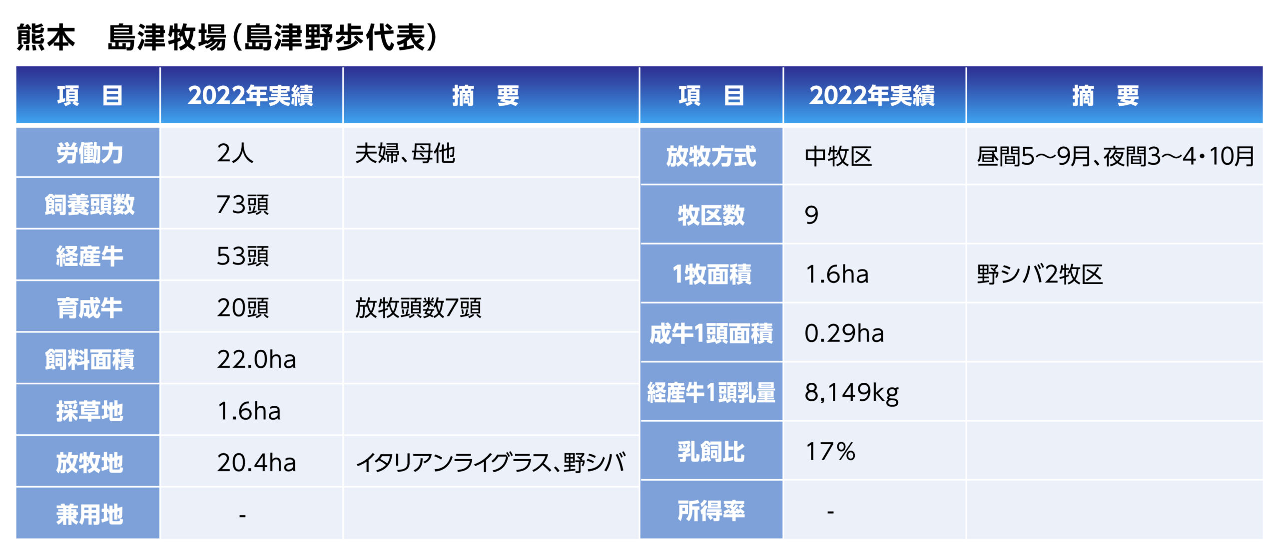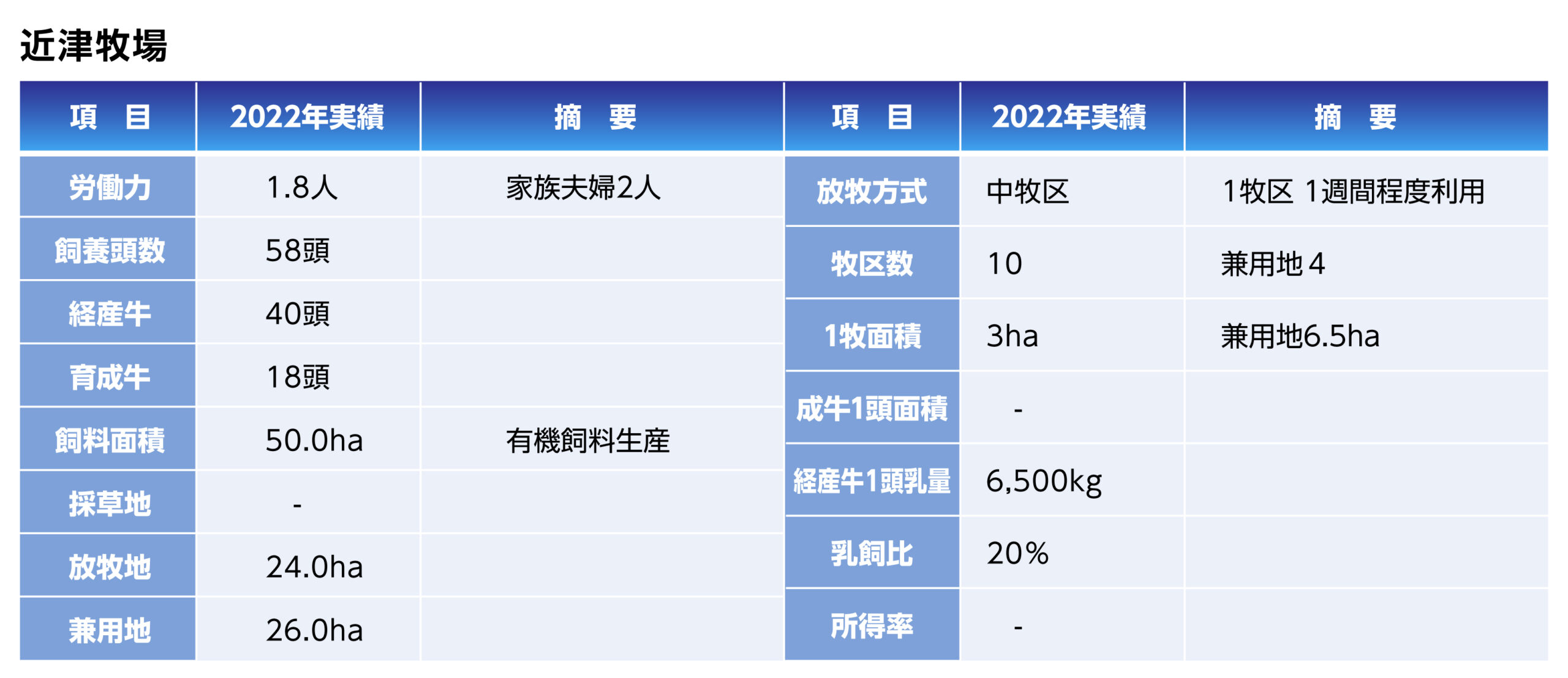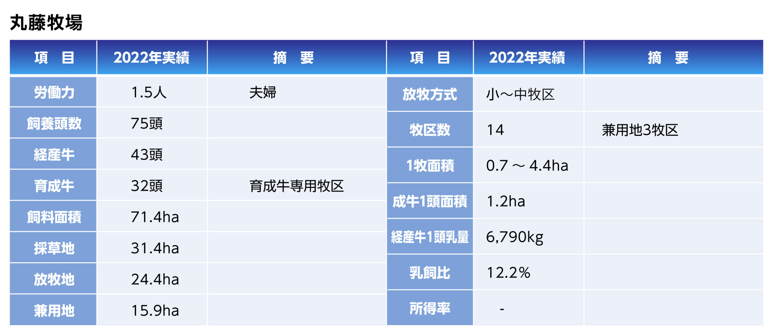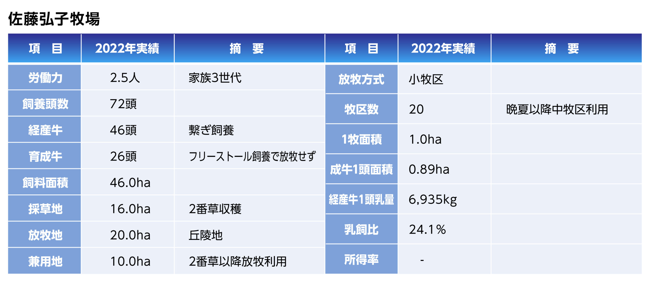 飼養規模は80頭前後で経産牛は53頭で推移しています。放牧専用地は17ha、兼用地27haとして兼用利用を多くしています。