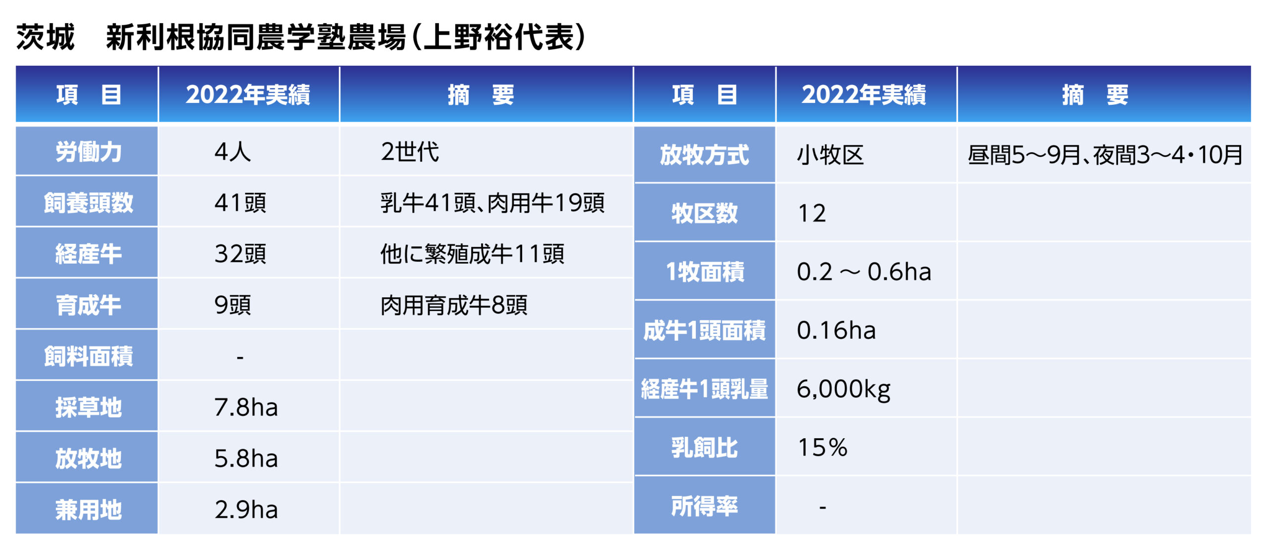 新利根協同農場は、新利根川河川敷に位置し、平坦地での放牧経営です。水田地帯でもあり、高速道路も放牧地内を走る市街近郊にあります。祖父である上野満氏が戦後開拓で入植し、当初は満州開拓団の仲間と水田酪農を開始した地域です。限られた土地条件の中で放牧を取り入れた数少ない農場です。現在は乳牛と繁殖和牛の複合経営です。放牧地は小牧区に編成して時間制限放牧(昼間放牧3~4月と10月、夜間放牧5~9月)を行っています。また、5年ほど前からチーズ工房(家族以外)も運営されています。後継者が就農して現在2世帯の家族経営です。
