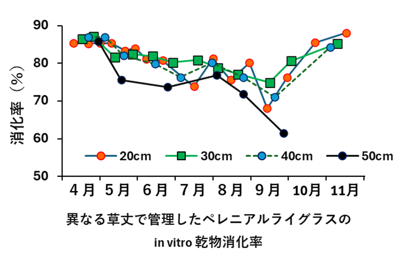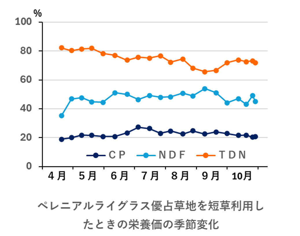 放牧酪農では、高栄養の草を効率的に牛に食べさせることが重要です。まず、代表的な放牧方法について、次に高栄養草地について解説します。連続放牧は、転牧の手間や牧柵資材が少なくてすむのですが、草の生産量や被食量の把握が難しいので、初心者は輪換放牧から始めるのがいいでしょう。暑熱の影響や放牧地面積に制限があるときは、夜間放牧や時間制限放牧に切り替えます。消化率の高い草は採食量も高く、栄養摂取量も高まります。短い草丈で利用すると消化率、粗タンパク質含量が高くなります。集約的な放牧利用に向いた高栄養牧草はペレニアルライグラスです。寒地型牧草利用が難しい暖地では、冬作物のイタリアンライグラスで冬から初夏まで放牧を行なっている事例もあります。