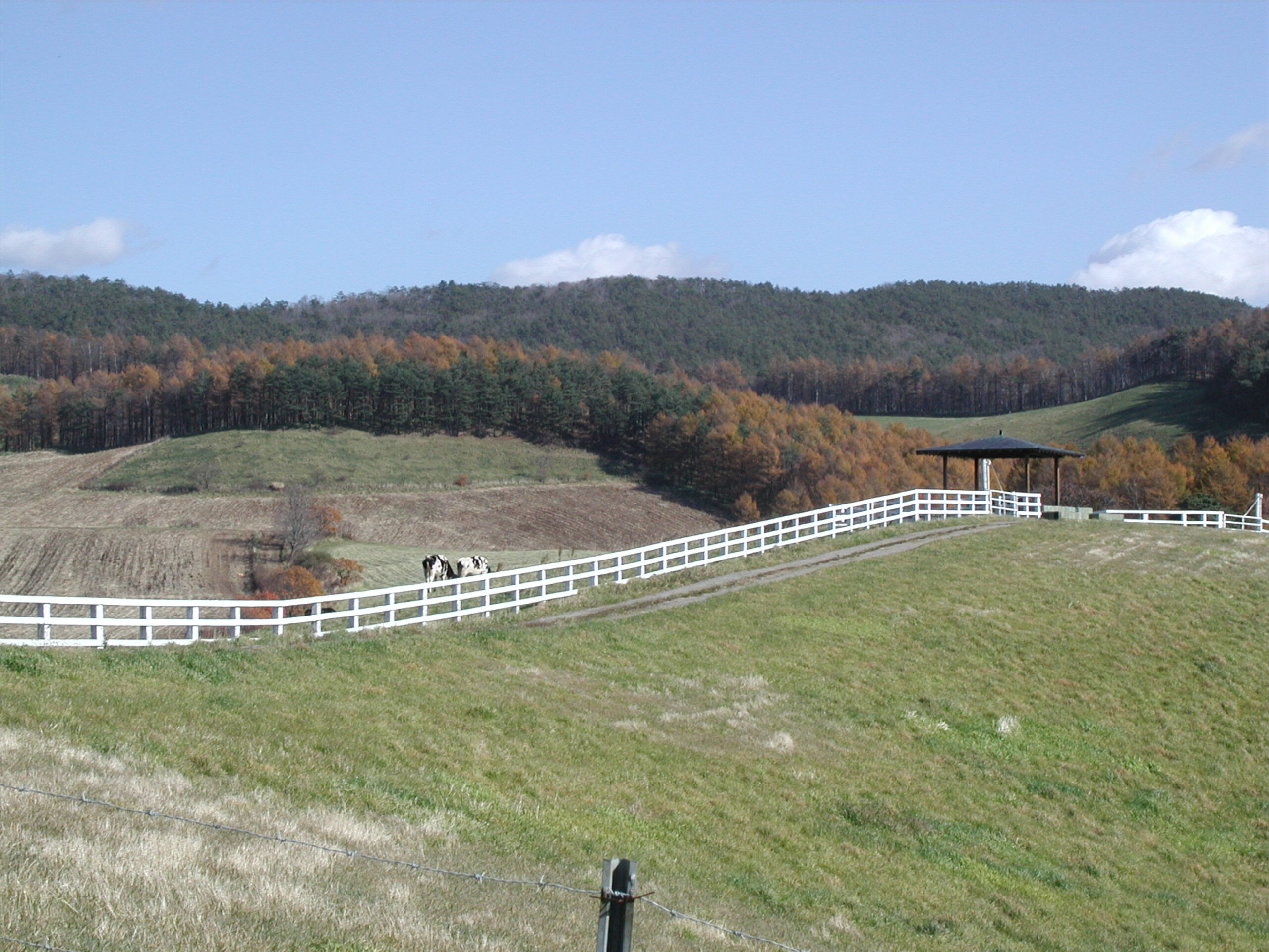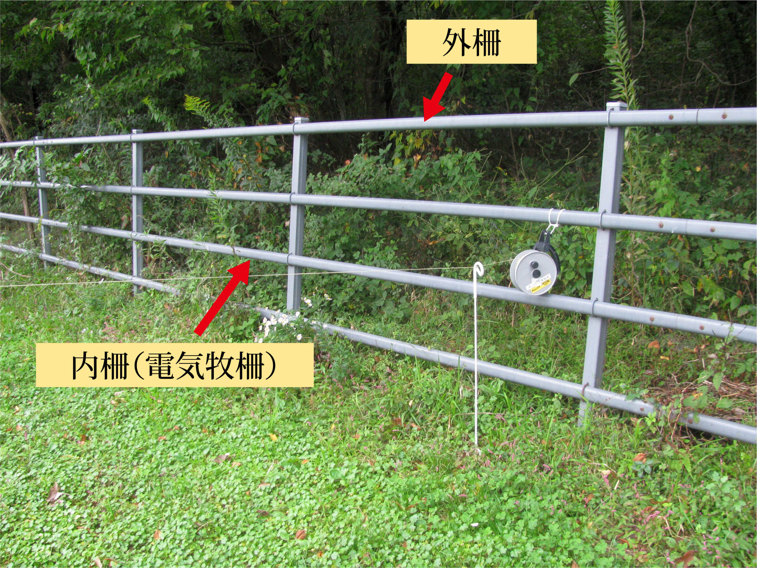 牧場の境界線には牛の脱走や野生動物侵入防止の丈夫な外柵を、放牧地内は移動が容易な簡易な電気牧柵を利用します。