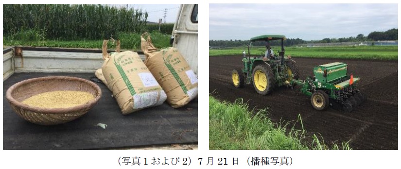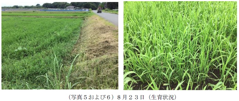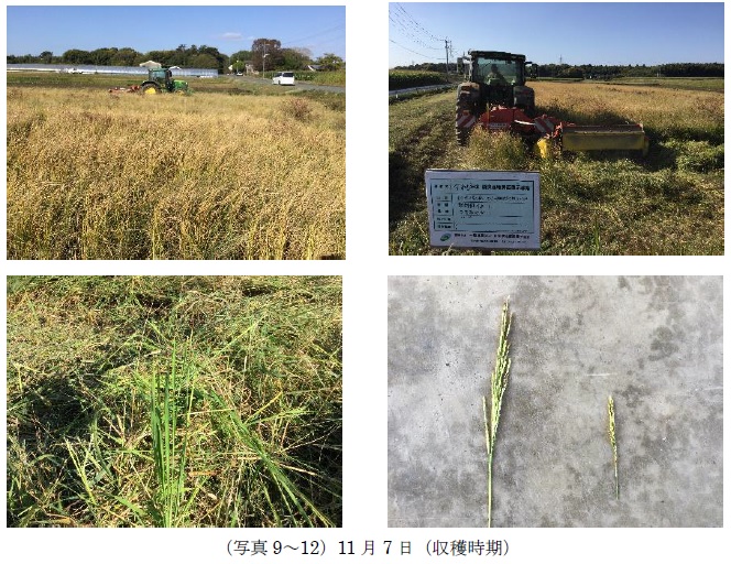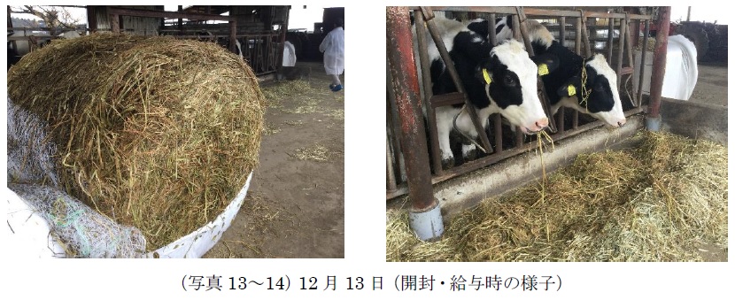 ・新品種を導入し展示して地域の飼料増産の普及につなげる。「つきあやか」は乾田直播体系による試験栽培を行い、7月21日に播種後、10月2日に出穂し、11月7日、8日にロールベール体系による収穫を行った(写真1~12)。例年、乾田直播体系の播種を7月上旬に実施するが、今年は天候不順でほ場に入れない期間が長く続き、7月21日まで遅れてしまった。初期生育は良好だったものの、播種が遅れたことによりハリビユなどの雑草が繁茂したため水張り時にフォローアップ粒剤を散布した。生育は概ね良好であったものの、水張り以降ヒエ類が繁茂しミナミユタカよりも草丈が低い傾向にあった。また、播種が遅かったことで、出穂は10月初めに確認された。ロールベール体系における実収量は径1.2m×高さ1.2mのロールで「つきあやか」は3.3個/10a、「ミナミユタカ」は4.7個/10aであった。今回展示した「つきあやか」は写真12のとおり、ミナミユタカと比べ穂が短く籾が少ないという品種特性が十分に発揮された。籾が少ないことで現場への種子供給が少ないことが短所であるが、種籾が来年も手に入るようであれば作付けしたい。12月11日に収穫したつきあやかのロールを開封し、育成牛へ給与したところ、サイレージ特有の匂いが感じられ嗜好性は良好であった(写真13~14)。 |