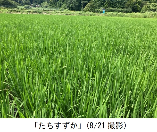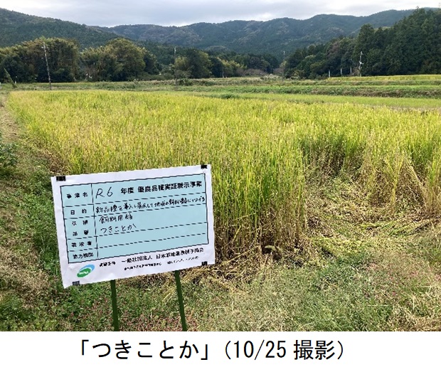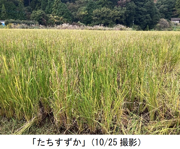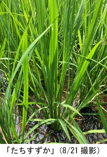 ・飼料用稲の品質改善のため極晩生品種を導入し「たちすずか」と比較栽培展示した。田植え後の活着は両品種とも良好だった。生育期間の「つきことか」は対象品種「たちすずか」に比べて草丈が高く、茎数が多かった。葉色(SPAD)は8月下旬でも40と高かった。8月下旬の幼穂長は「つきことか」が1㎜、「たちすずか」が15㎜だった。出穂期は「つきことか」が9月25日、「たちすずか」が9月5日だった。収穫時の調査では、「つきことか」の草丈が高く、穂数が多く、穂長が短かった。坪刈りを10月25日に実施した。生草収量は「つきことか」がやや多かった。(「たちすずか」比108%)。実収は「つきことか」が6.2ロール/10a、「たちすずか」が5.7ロール/10aだった(1ロール270kg)。今回展示圃を設置した経緯として、地域で収穫機を順番に使用しており、当経営体が最後に刈り取りを行っているが、例年収穫が遅れ適期を外れてしまいロール品質が悪い。管内では「たちすずか」を栽培しているが、より晩生の「つきことか」を導入することで品質が改善するか検討するため設置した。品種特性どおり、「つきことか」の出穂は「たちすずか」よりも20日遅く、収穫適期(出穂30~40日後)を遅らせることができた。また「つきことか」は穂長が短く、籾数が少ないことから牛の消化に良い製品ができると感じた。一方、現在管内で使用している機械では長稈だと長い切片が残りWCS品質が悪化する可能性があった。また、出穂は遅かったものの、坪刈り時(10月下旬)には同じくらいの枯れ具合だったため、品質改善に繋がらなかった。現状の収穫体制では「たちすずか」の方が適すると判断された。 |
