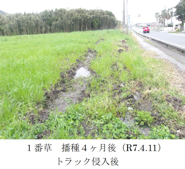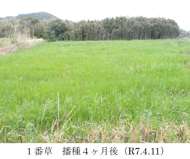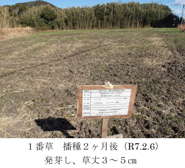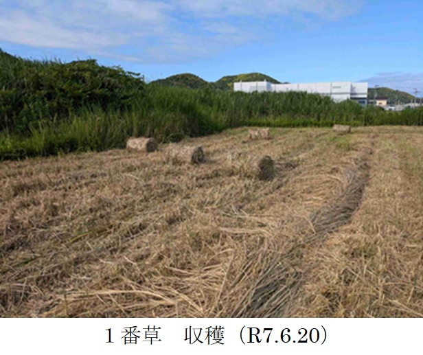 | 栽培概況 気象・生育・展示 | ・新品種を導入し展示して地域の飼料増産の普及につなげる。1番草は令和6年12月~令和7年春にかけて、生育は概ね良好であった。収獲は令和7年6月20日に行った。収穫時の草丈は100~120㎝であった。水はけの悪い水田で栽培したため、畑で栽培するより収量が低い結果になったと考えられた。この土地での収量水準としては例年通りであった。一部のほ場でトラックが侵入し、ほ場が荒れるというアクシデントがあった。 |