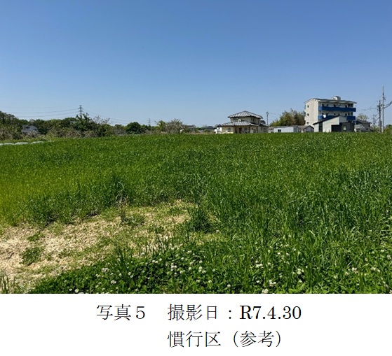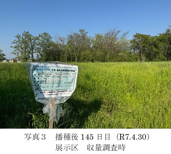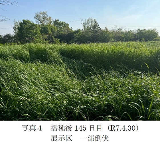 | 栽培概況 気象・生育・展示 | ・新品種を導入し展示して地域の飼料増産の普及につなげる。はやまき18の初期生育は慣行品種に比べよく生育した。草丈平均を比較すると、慣行品種と比べ約1.2倍大きかった。展示区の一部(全体の2~3割)で倒伏が見られた箇所があった(写真4)。生育期間中、病害虫の発生はなかった。収量性は、慣行品種に比べ約1.4倍の生草収量、1.1倍の乾物収量が得られた。今年度の収穫で収量が多く得られたため、より長く自給飼料を給餌できて助かっている。慣行品種よりはやまき18の方が生育、収量が良好であったため、取引先の種苗会社で取扱いがあれば是非使用したい。 |