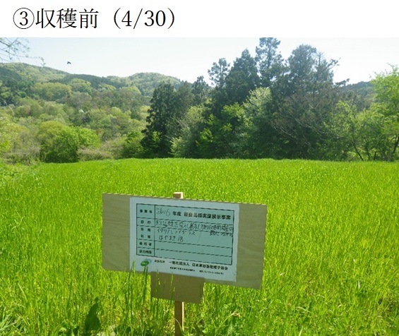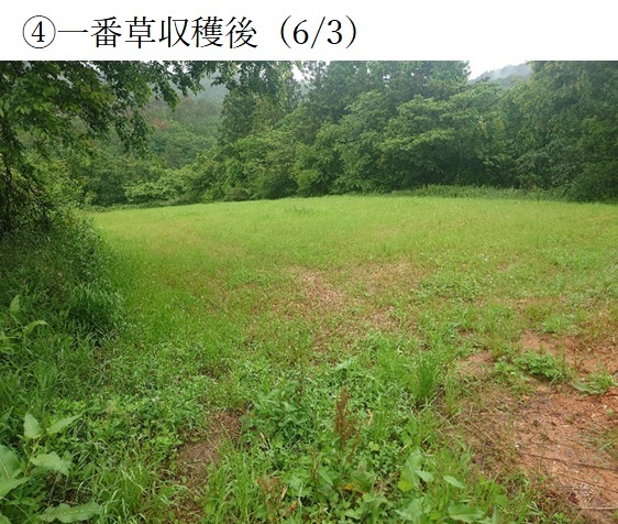 ・新品種を導入し展示して地域の飼料増産の普及に繋げるために、既存品種と比較する。播種は10月5日に実施。播種後10日程度で発芽し、10月末で草丈10㎝程度と順調に生育した。12月初旬から、平年に比べ降雪が多く、長い時で1週間程度雪に埋もれたため、2月以降雪腐れ病による黄化が見られた。3月下旬以降生育旺盛となり、分げつ、草丈の伸長が本格化し、4月10日時点で草丈30~40㎝となった。収穫前(4月30日)の1番草は草丈が90㎝になった(収量は別表の通りである)。繁殖牛に乾草として給与しており、採食状況は良好である。 |
