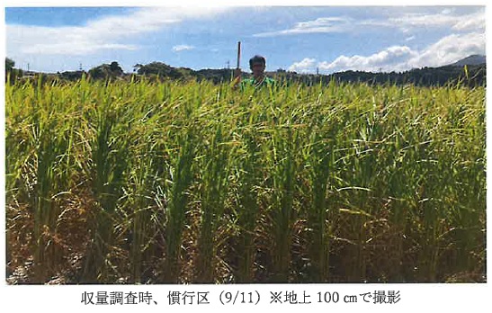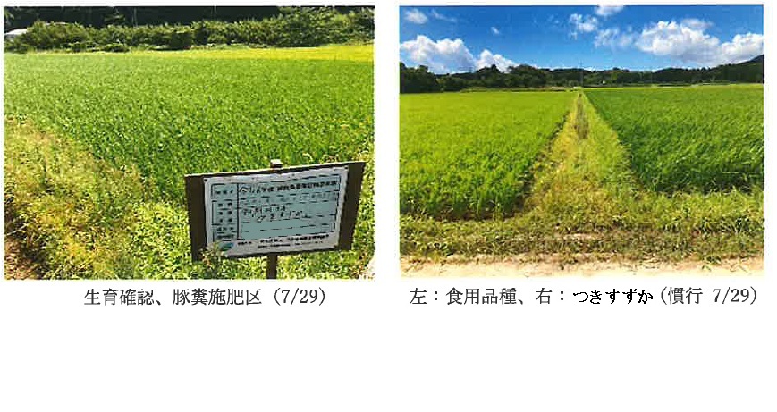 | 栽培概況 気象・生育・展示 | ・新品種を導入し展示して地域の飼料増産の普及につなげる。生育は慣行区および豚糞施肥区ともに同等であった。病害は、両区ともに紋枯病の発生がわずかに見られた。虫害は、8月中旬にコブノメイガの被害が見られた。9月3日にトレボン粉剤DLの散布を行ったが、収穫調査時点では両区とも全体的に中程度の被害が見られた。雑草の発生は少なく、水稲生育への影響は見られなかった。生草収量は、慣行区が豚糞施肥区より183kg/10a多かった。乾物収量は、慣行区が豚糞施肥区より83kg/10a多かった。1kgあたり生産コスト※は、慣行区22.4円/kg、豚糞施肥区18.8円/kgと豚糞施肥区が3.6円/kg低かった。以上より、「つきすずか」および豚糞施肥による有用性を得ることができ、展示を通じ有用性を周知することで五島地域内の普及は進むと考えられる。 ※生産コストは物財費(種子代、肥料代、豚糞代、農薬代)のみで算出 ※参考:栽植密度(株/㎡)慣行区14.7、豚糞施肥区14.9 |