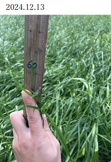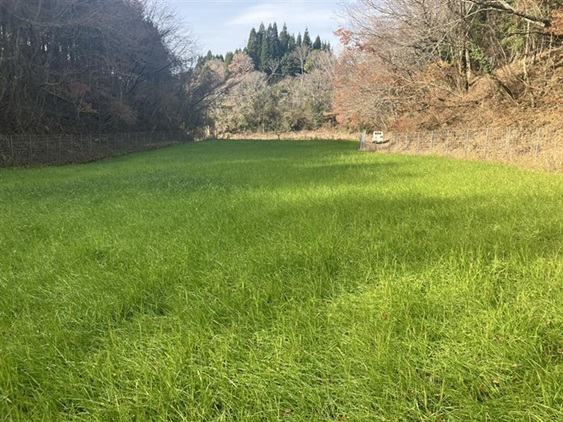 | 栽培概況 気象・生育・展示 | ・新たな栽培体系を取り入れて飼料増産につなげる。展示圃場は標高が800mと高冷地で1番草の収穫が遅くなる傾向。初期の生育は順調に生育しており、12月の中旬には40㎝~80㎝程度まで生育しており、生育の良い場所で1割程度出穂も見られたが、1月から2月にかけて厳しい寒さとなり、また降雨も少なかったため生育が停滞した。1月の収穫を計画していたが、降雪があり収穫時期が遅れてしまったため、収穫時、雪により葉の先端が枯れたようになってしまい、収量が少なかった。病害虫の発生による被害は無く、また倒伏も無かった。栄養成分については、乾物中の粗タンパク質が16.9%、TDNが70%となっており、高品質な粗飼料が生産できた。12月までの生育については順調に生育することができたが、天候により適期に収穫することができなかった。いもち病などの病害もなかったことから、播種日をより早め生育期間を確保するなど地域にあった栽培方法を検討する必要がある。 |