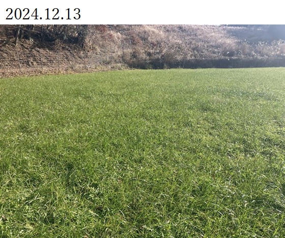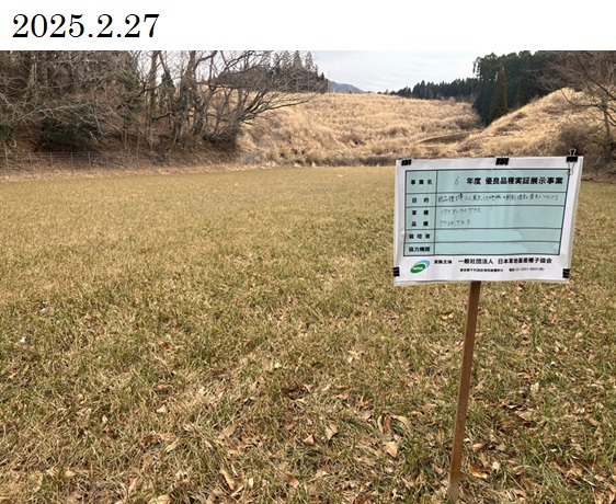 | 栽培概況 気象・生育・展示 | ・新たな栽培体系を取り入れての飼料増産につなげる。展示圃場は標高が800mと高冷地で1番草の収穫が遅くなる傾向がある。順調に生育しており、12月の中旬には40㎝程度まで生育した。1月から2月にかけて厳しい寒さとなり、また降雨も少なかったため生育が停滞した。病害虫の発生による被害は無く、また倒伏も無かった。降雪、積雪があり、寒さが厳しかったため、葉の先が枯れたようになってしまい収量が少なくなってしまった。調査時の草丈は54.5㎝。栄養成分については、乾物中の粗タンパク質が14.0%、TDNが72%となっており、栄養価が高く高品質な粗飼料が生産できた。 |