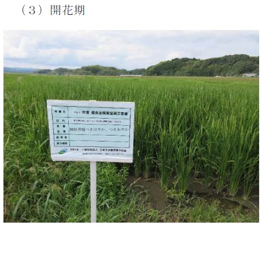 ・新品種を導入し展示して地域の飼料増産の普及につなげる。つきはやかは7月1日に移植後、8月20日前後に出穂し、9月30日の調査時のステージは黄熟期~完熟期で、期間中の生育は順調であった。調査時まで倒伏は無かった。生草収量は、3,000kg/10a、乾物収量は、1,355kgであった。稈長96.3㎝、穂長は13.5㎝であったが、他の試験ほ等の結果と比較してやや低い状況であった。また、1株当たりの茎数はやや少ない状況で、収量はやや低い結果であった。栽培管理の影響も考えられ、移植時期や施肥等の検討が必要であると感じられた。つきあやかは7月1日に移植後、8月20日前後に出穂し、9月30日の調査時のステージは黄熟期で、期間中の生育は順調であった。生草収量は、4,,850kg/10a、乾物収量は、1,546kgであった。稈長101.1㎝、穂長は11.05㎝であったが、他の試験ほ等の結果と比較してやや低い状況であった。また、1株当たりの茎数はつきはやかより多い状況で、収量は概ね良好と判断された。稈長等が他の試験ほの結果と比較してやや低く栽培管理の影響も考えられ、移植時期や施肥等の検討が必要であると感じられた。調査時まで倒伏は見られなかった。また、つきあやかは、いもち病やコブノメイガの食害が僅かだが観察された。 |