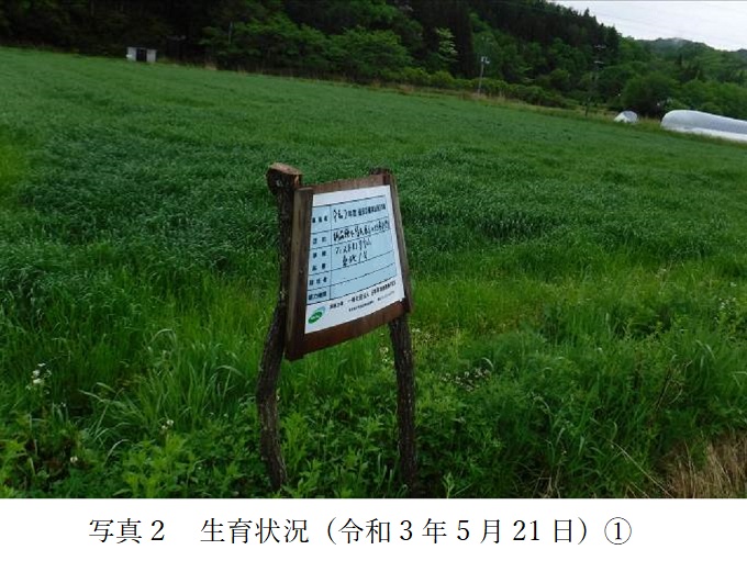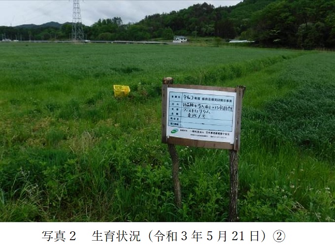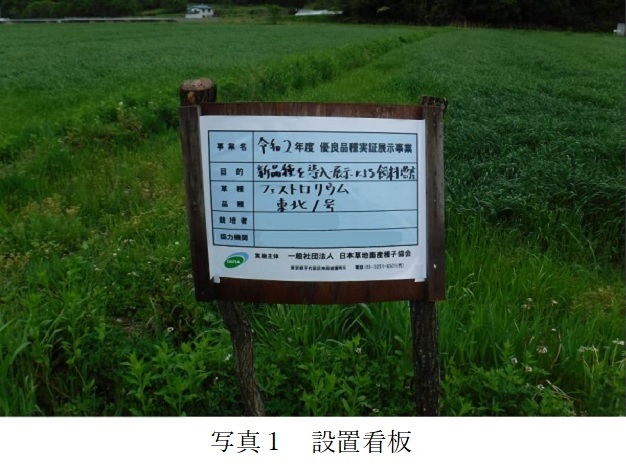 | 栽培概況 気象・生育・展示 | ・地目は田。東北南部高冷地(標高約500m)である飯館村において、湿害に強く水田での収量が安定している品種と判断して栽培展示した。4月4・5日にオール14を40㎏/10a追肥。調査日は出穂期。播種日が、地域のオ-チャドグラス(8月下旬~9月中旬)より遅かった(10月中旬)にも拘わらず、生育は旺盛で、病虫害の発生も無く、一番草の収量は満足できる結果であった。展示品種の地域における普及上の残された課題は、二・三番草の収量と牛の嗜好性であるが、特に牛の嗜好性が良ければ普及を推進すべき品種であると思われる。 |