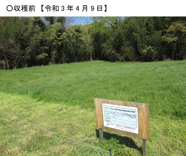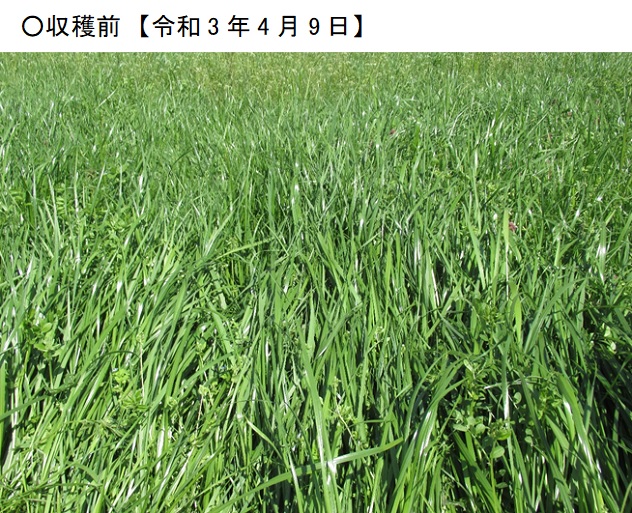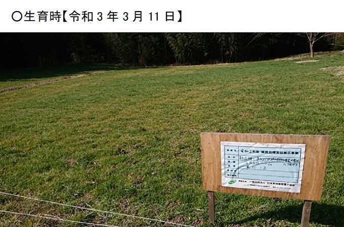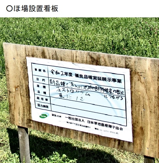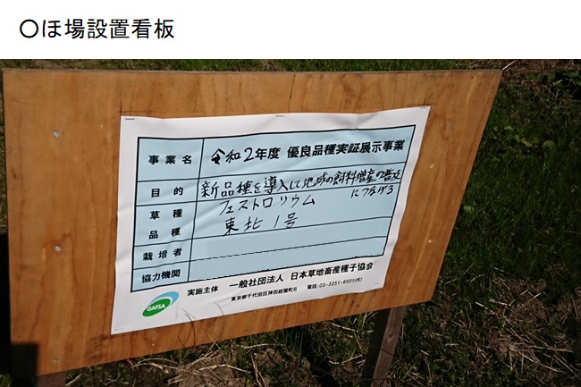 | 栽培概況 気象・生育・展示 | ・新たな栽培体系を取り入れ地域の飼料増産につなげるため、栽培展示した。播種一か月後の初期生育は良好で、被度も良好であった。乾物収量においては、乾物率が低めで408kg/10a程度の収量となった。収量調査時の生育ステージは写真では未出穂。ほ場設置者はフェストロリウムは初期生育も良く、収量も良好であったので、今後も作付けが期待できる。 |