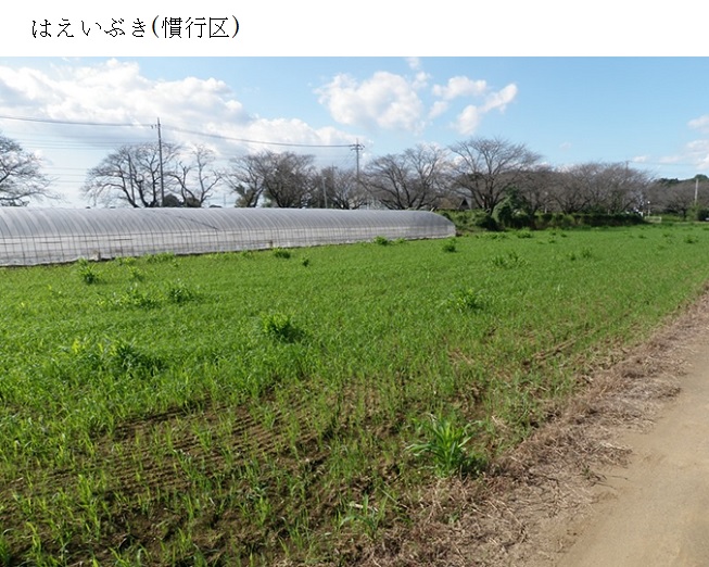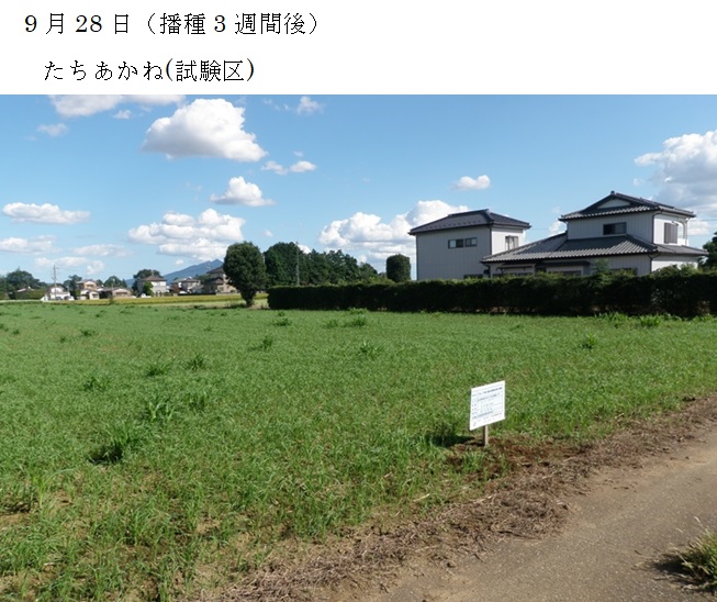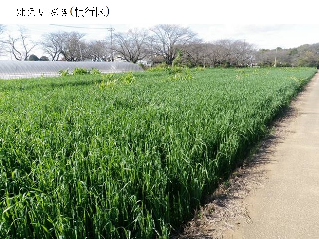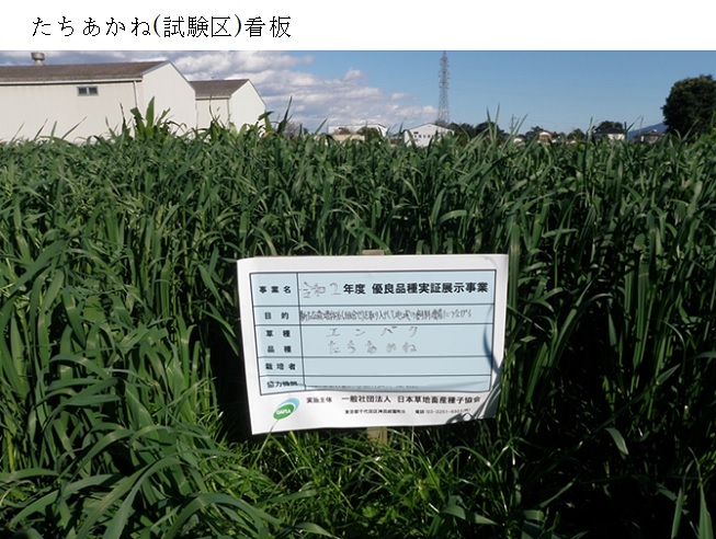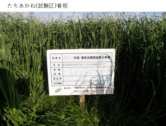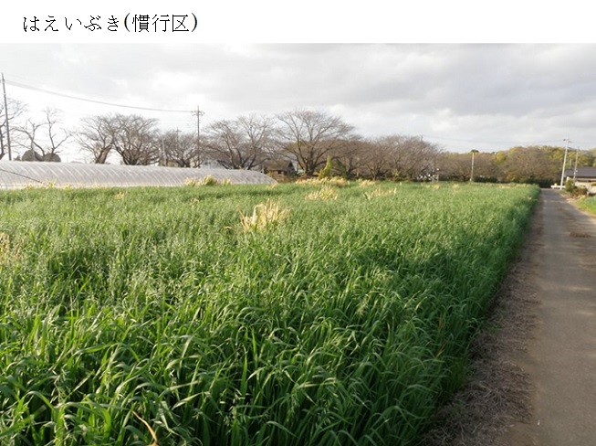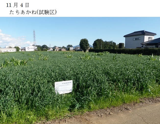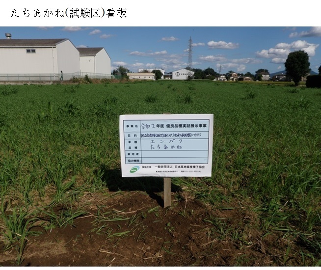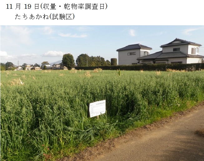 | 栽培概況 気象・生育・展示 | ・エンバクの極早生品種「たちあかね」の当地域での収量性について検討する。令和2年9月7日,除草剤ゴーゴーサン乳剤を10aあたり原液300㎖を100ℓに希釈して散布。試験区,慣行区ともに,病害虫・雑草の発生は,ほぼ見られなかった。殆ど倒伏せず、収穫時の作業性は良好であった。耐倒伏性が高く生産性に優れていた。 |