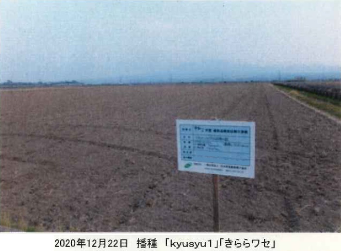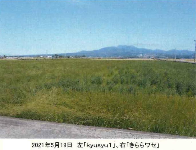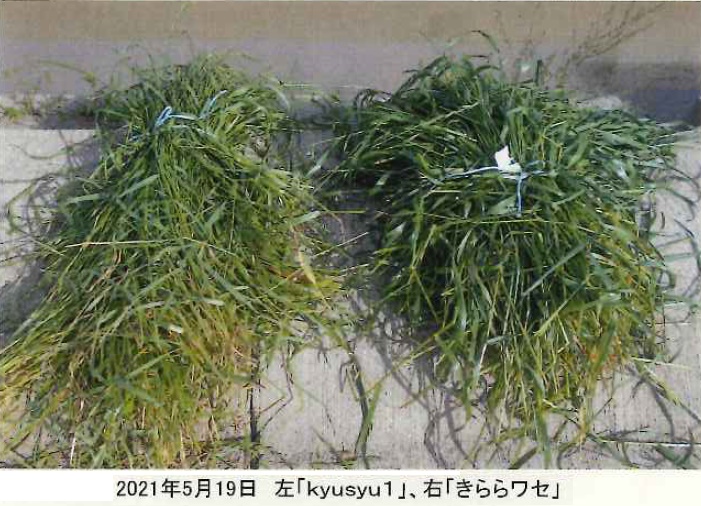・水稲後作の水田における新たなイタリアンライグラスの品種を栽培し、地域の飼料増産につなげる。 普通期水稲の収穫を終えた水田裏でのイタリアンライグラス作付けは12月後半まで遅れる場合が少なくない。新たなイタリアンライグラスの品種「Kyusyu1」「きららワセ」の播種を、担当農家が実施可能となった、12月22日に播種した。 収量調査は、2021年4月2日(両品種とも出穂期)、「Kyusyu1」の草丈113㎝、「きららワセ」の草丈83㎝。5月19日「Kyusyu1」草丈107㎝の開花期、「きららワセ」草丈118㎝の開花初期の2回刈りを行なった。1番草収量はKyushu1が、2番草収量はきららワセがそれぞれ優った。合計収量は、良品種とも、ほぼ同じ収量となった。「Kyusyu1」は茎が大変細く、乾草調整に適していると考えられた。 「きららワセ」は再生力が強く、後作に水稲を作付けしない場合は、さらに3回目の再生草の刈り取りを行なうことが出来ると考えられる。 12月22日の遅い播種であっても、諫早市においては、翌春4月以降のイタリアンライグラスの収穫を十分に得ることが出来る。 |