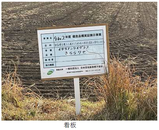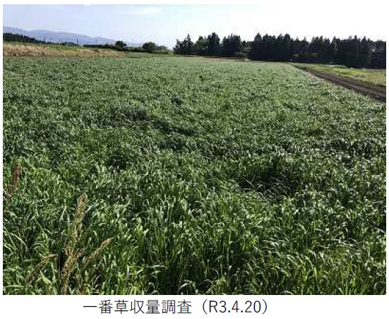 | 栽培概況 気象・生育・展示 | ・新品種の導入・展示により、地域の飼料増産につなげるため。栽培期間中の生育は良好であり、雑草や病害虫も見られず、倒伏も少なかった。生草収量(穂孕み期で草丈は128.9㎝)は多かったが、乾物率が低く、乾物収量では他展示ほど大きな差は見られなかった。乾物中の硝酸態窒素が3,624ppmと高く、硝酸態窒素が高い飼料は給与したくないという農家の意向により、収穫した飼料は給与せず、再生草も収穫しないこととなった。施肥は化成肥料のみであったが、前作(かんしょ)の残肥の影響が大きいと考えている。 |