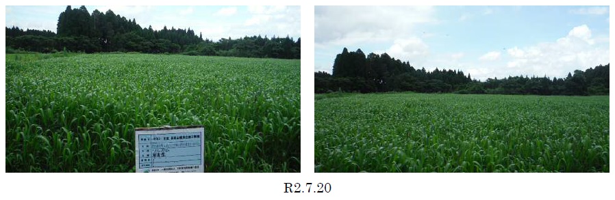 | 栽培概況 気象・生育・展示 | ・新品種を導入し展示して地域の飼料増産の普及につなげる。追肥 8月5日尿素13㎏/10a。地域において自給飼料の増産に優れた品種と判断し、栽培展示した。一番草については、長雨のためか茎が細く草丈もそこまで高くならなかった。二番草については、密生していないものの、生育は良好であった。1番草の草丈175cm、出穂直前、ロール120cm×2.8個/10a。2番草の草丈173cm、出穂前、ロール120cm×3.2個/10a。農家からも、再生草でも収量が取れたとの評価をいただいた。 |