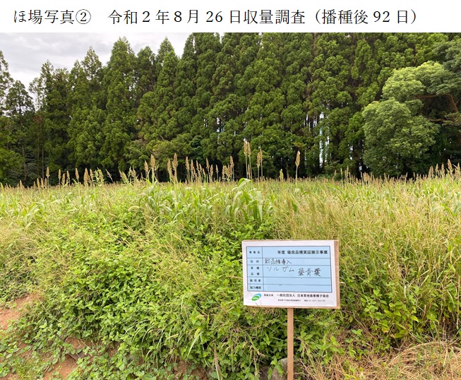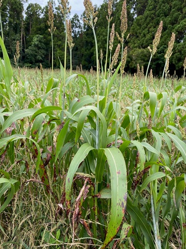 | 栽培概況 気象・生育・展示 | ・新品種を展示して地域の飼料増産の普及につなげる。生育時期の集中豪雨や日照不足の影響なのか,生育は思わしくなかった。(他のほ場で栽培した別品種も同様。今年は全体的に良くなかった)一部に病気の発生が見られた。追加報告:収穫時の草丈166.5cm、収穫後の再生力は未確認。嗜好性がよく、良く食べた。*写真の葉病は豹紋病?。 |