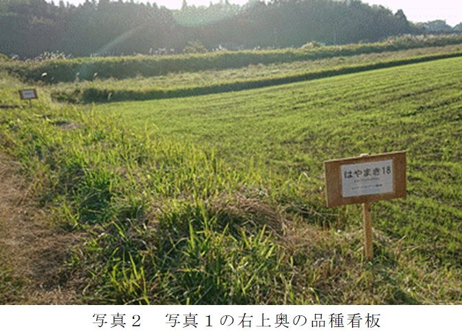 | 栽培概況 気象・生育・展示 | ・肝属南部地域において9月の播種の早まき品種として,高温耐性といもち病抵抗性に優れた品種と判断したことから,地域適応性を確認するために栽培展示する。今回は,圃場の準備状況の遅れや天候の関係で,播種が当初予定の1ヶ月遅れとなった。生育初期にギシギシ(雑草)が出てきたため,ハーモニーによる雑草防除を行った際,イタリアンライグラスの葉先が若干しおれた。2月はじめまでは,草丈25cm程度であったが,2月下旬から急速な伸長が見られた。3/16の初回調査時は,1割出穂始めの状態であった。1回目の収穫日は3月24日。5/17時点では,開花直前であった。また若干茎が太く葉も太い感じであり,下葉が少し蒸れやすい印象を受けた。10a当り乾物収量(2回刈取)は1,165kgであった。肝属郡錦江町の田代地区は,下場(錦江湾沿い)に比べ標高が約200m高い山間盆地に当たることから,気温が下場より3~4度低いと言われている。さらに早まきできる可能性が高い。 |