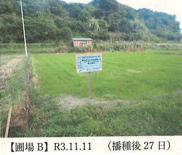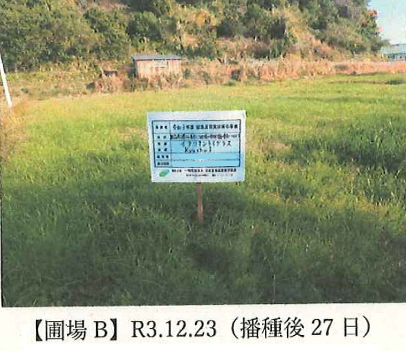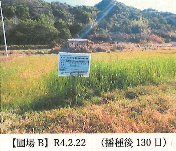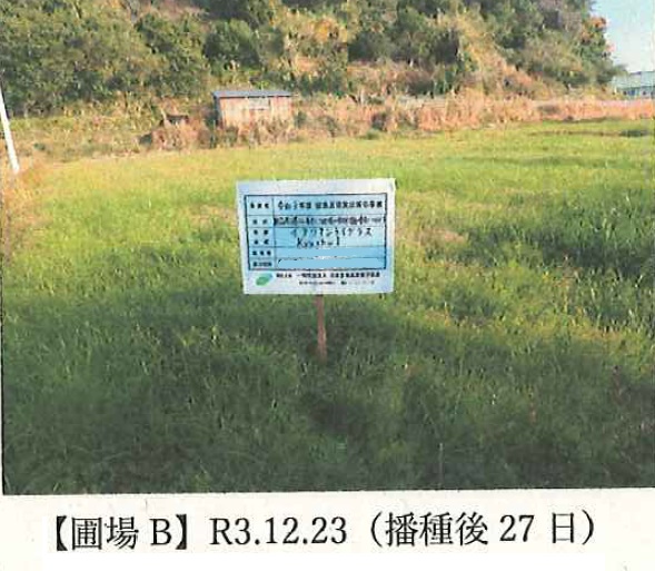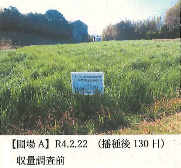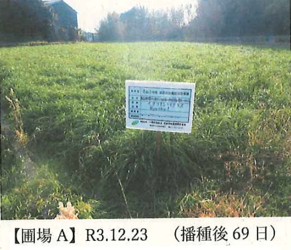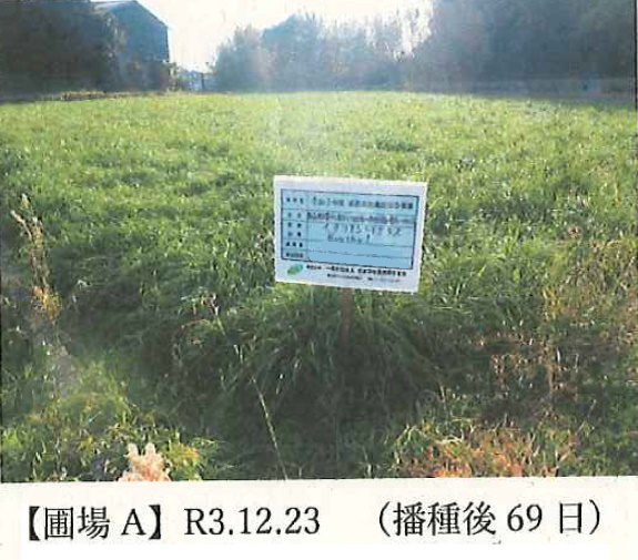 | 栽培概況 気象・生育・展示 | ・地域において収量性に優れた品種と判断し栽培展示した。期間中気温は高めで推移し、初期生育も旺盛で多収であった。調査時(3月11日)のステージは出穂前で草丈93.5cm、収量6,240kg/10a。一般成分の分析結果は、乾物率14.1%、粗蛋白15.7%、可溶性無窒素物46.9%、粗脂肪3.1%、粗繊維23.9%、TDN71.3%。また、病害虫、倒伏も特に認められなかったが、硝酸態窒素濃度がやや高かった。 |