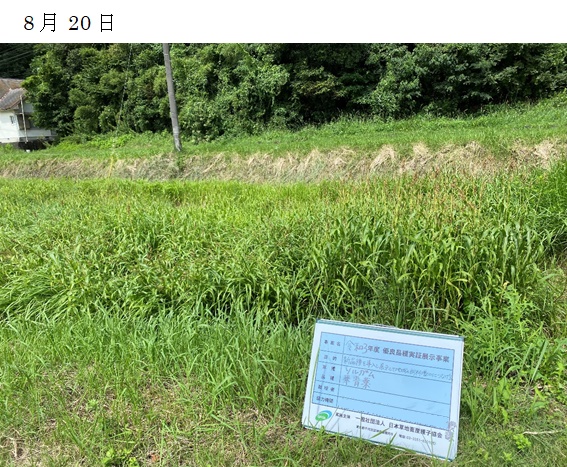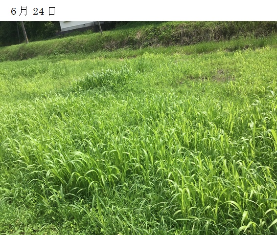 | 栽培概況 気象・生育・展示 | ・新品種を導入し展示して地域の飼料増産の普及につなげる。化成肥料20~40kg/10a。調査日は出穂期で草丈161.8㎝。倒伏あり。今年は例年と比較し梅雨入りが早く播種が例年よりも遅れたことにより、全体的な生育スケジュールが後ろ倒しになった。ほ場内で生育状況にかなりばらつきがあり、排水の良い箇所、悪い箇所があったためと推察される。8月上旬から中旬にかけての台風及び豪雨の影響により一部倒伏が見られた。草丈及び収量ともに伸び悩んだのは、天候不良の影響が大きい。また、イノシシ害がひどく、ほ場を一部掘り起こされてしまった。改めて鳥獣害対策の必要性を感じたため、今後は対策を講じていきたい。 |