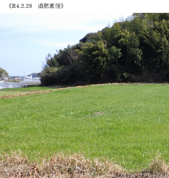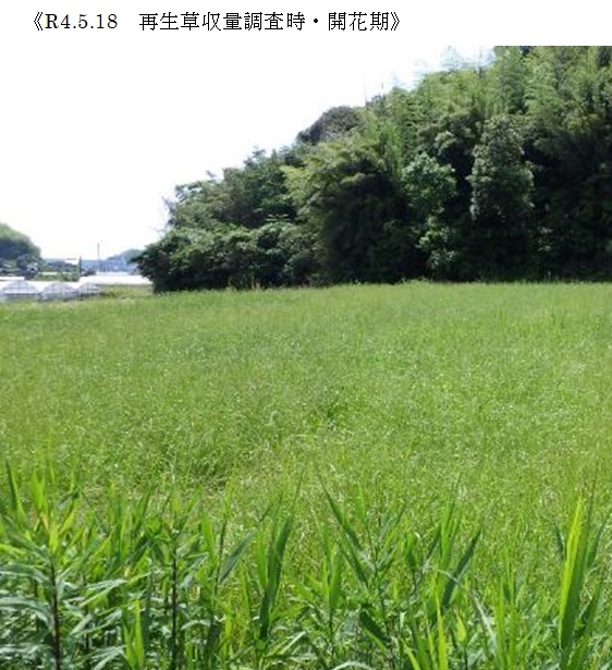 ・新品種を導入し展示して地域の飼料増産の普及につなげるという目的に加え、適切な土壌管理を行うという観点で展示ほを設置。土壌分析の結果、加里、苦土、石灰、リンとも充足していたが、窒素分の不足が確認された。そのため、基肥として尿素の施用を提案したが実施されなかったこともあり初期生育が悪い状況であった。生育期間中の気象概要として、降水量は平年よりやや少ない傾向で気温は概ね平年並みであったが、播種時期の10月中~下旬にかけてはやや低い傾向であった。播種後ギシギシの繁茂が見られたことから除草剤の散布を11月末に行った。2月25日に生育後期での追肥として尿素を施用し、3月31日に穂ばらみ期で1番草の収量調査を実施した。生草収量は5,000kg/10a、TDN収量は442.5kg/10aであった。1番草収穫後4月上旬に追肥を実施したが、再生草は長雨のため収穫適期を逃し、5月18日に開花期で収量調査を行った。生草収量は2,250kg/10a、TDN収量は257.4kg/10aであった。収量としては概ね標準程度確保できたものの、栄養成分はタンパク質含有率が標準値に対して7割程度の値しか含まれず、初期生育時の窒素不足がその後の生育、栄養成分に大いに影響するのではないかと思われた。 |