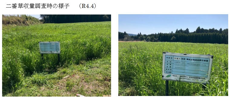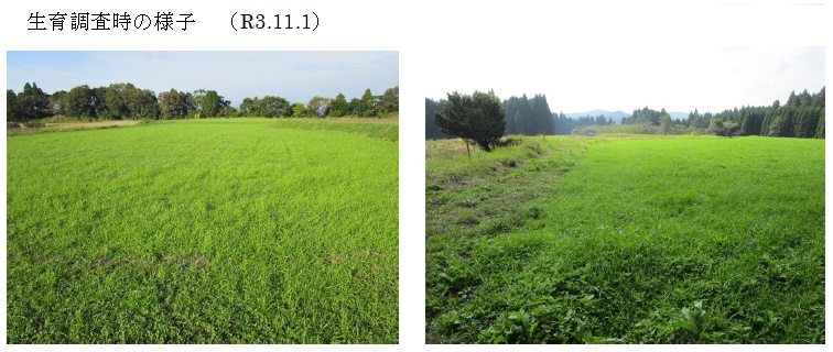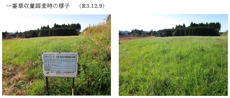 | 栽培概況 気象・生育・展示 | ・新品種を導入し展示して地域の飼料増産の普及につなげる。9月上旬の播種だったが、いもち病等の病害発生は見られなかった。生育初期の段階では雑草の発生が確認されたが、気温の低下に伴い雑草は減少した。昨年鳥獣害が発生したため、今年度は電柵の設置を発芽初期から実施。そのため被害は見られなかった。12月の1番草の収量調査では、草丈96.8cmで穂ばらみ期だった。生育については良好で、年内刈り取りが可能だった。 |