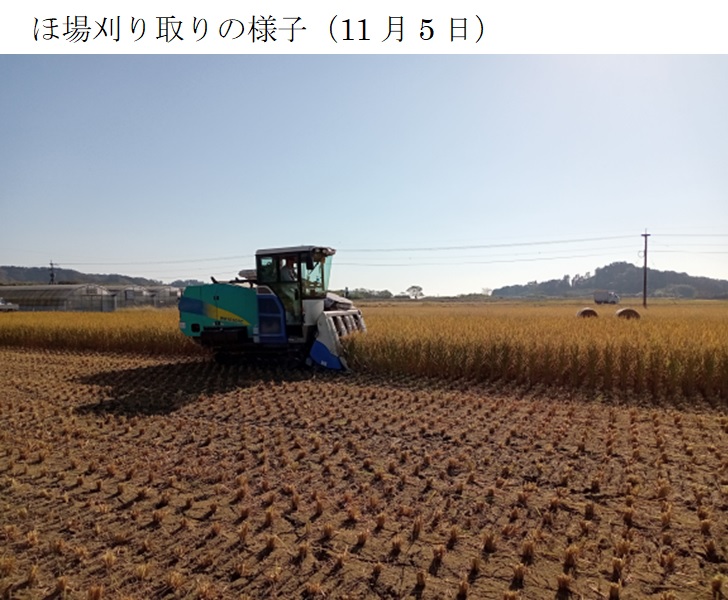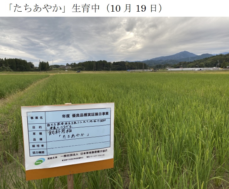 | 栽培概況 気象・生育・展示 | ・早期水稲の後作で飼料用イネを組み合わせた2期作が可能かを検討するために栽培した。長雨を避け8月24日に移植が行われた。移植直後はスクミリンゴカイによる食害がほ場の一部に見られた。生育初期は、病害や気象による被害はなく順調に生育した。10月中旬に出穂を迎え、出穂前後にニカメイチュウの発生が見られ、ほ場の一部が被害を受けた。11月初旬には黄熟期を迎え収穫が行われた。遅植えにより、栄養生長の期間が短くなり収量が減少したと思われる。また、出穂までの期間も、6月移植の場合と比較し、2週間ほど短くなっていた。「たちはやて・たちあやか」を給与した畜産農家によると、秋に栽培した場合、牛の嗜好性が良く、一般的な栽培方法のものと比較して、良く食べる傾向にあるとのことであった。栽培期間が短いために植物組織の生長量が小さく、柔らかいため好んだ可能性がある。 |