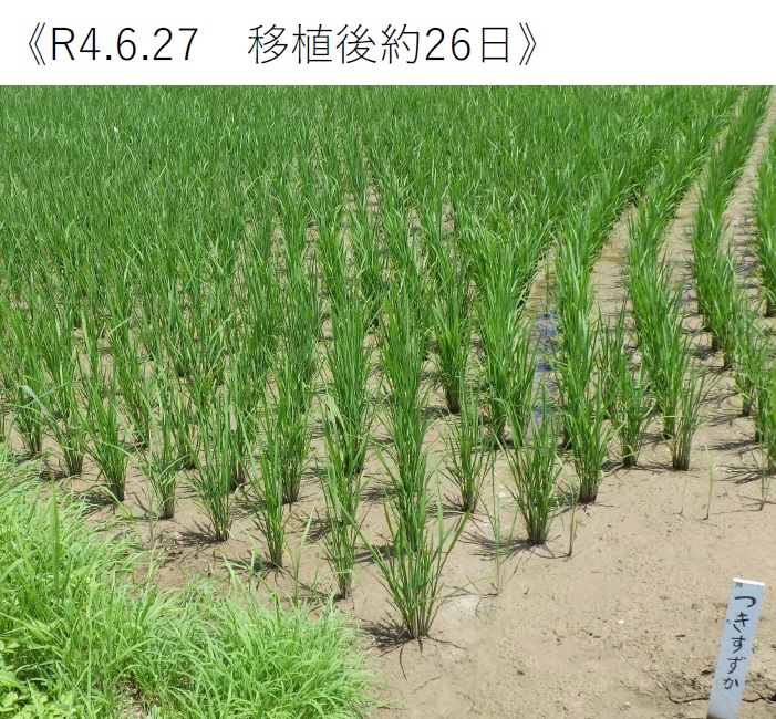 | 栽培概況 気象・生育・展示 | ・令和4年5月6日に播種し、育苗も問題なく進んだ。6月1日の移植後順調に生育し、生育の良さを感じた。土壌消毒として、立枯病防除薬(ダコニール)を使用し、移植時に害虫対策のため箱施薬(ツインキック)を散布し、ヒエ対策として移植後に除草剤(ジャスタジャンボ)を散布した。生育は概ね順調であり、病気等も確認されなかった。6月上旬に移植し、8月下旬には出穂期を迎え、草丈については、慣行品種と比較するとやや低い状況が見受けられた。栄養成分分析を実施し、TDN収量は784kg/10aであった。 |