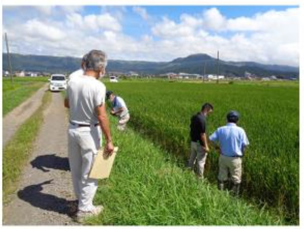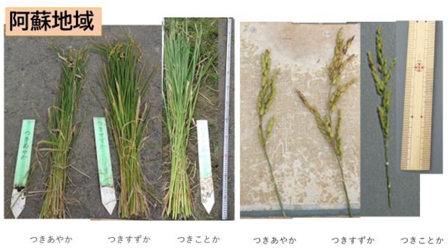 ・近年の気象変動や不安定な国際情勢等に起因する原油高、円安等の影響により飼料価格が高騰する中、飼料用イネ(WCS用イネ)は水田を活用した良質な粗飼料として広く利用されている。特に、阿蘇地域は県内でも上位の作付面積となっているが、新たに育成された極短穂型品種の「つきあやか(中生)」、「つきすずか(晩生)」、「つきことか(極晩生)」の3品種について阿蘇市に展示圃を設置し、現地試験を行った極短穂型品種は、穂が短く籾の収量が極端に少ない品種である。WCS(ホールクロップサイレージ)に調製時の乳酸発酵が促進され、良質サイレージの生産が可能であることに加えて、光合成された糖分が籾ではなく茎葉に蓄積されることなどから牛の嗜好性が良好で消化性が高いとされている。出穂日は「つきあやか」9月3日、「つきすずか」9月6日、「つきことか」9月21日。極短穂型品種の収穫は、出穂からおよそ30日後が適期とされているので、「つきあやか」と「つきすずか」は、9月29日に収穫時の調査を行った。調査時の生育ステージは、中生の「つきあやか」、晩生の「つきすずか」は完熟期だった。「つきあやか」は、全体にいもち病が見られた。極晩生の「つきことか」は、後作の関係から10月4日に調査を行った。「つきことか」は、出穂日が9月21日と遅かったため、10月初めでも乳熟期だった。阿蘇地域では10月に入ると気温が下がるため、それ以降の登熟は期待できないと思われる。「つきあやか」の稈長は、「つきすずか」と同程度で「つきことか」より短かった。「つきあやか」の穂長は、「つきことか」と同程度で「つきすずか」よりやや短かった。10aあたりの乾物収量は、「つきあやか」<「つきすずか」<「つきことか」の順だった。考察:試験した3品種は、いずれも隣接する圃場において同一耕種条件で栽培したものの、「つきあやか」にはいもち病の発生が見られたことから、本病への抵抗性が他の2品種より低いと思われ、当地域での栽培は検討が必要である。また、「つきことか」は出穂が遅く、当地域では10月に入っても登熟が進まないことから、出穂30日以降が収穫適期という極短穂型品種の特性を生かすことは難しいと思われる。これらのことから、「つきすずか」が当地域の栽培に適する品種と考えられる。 |