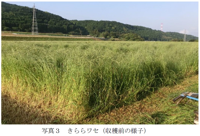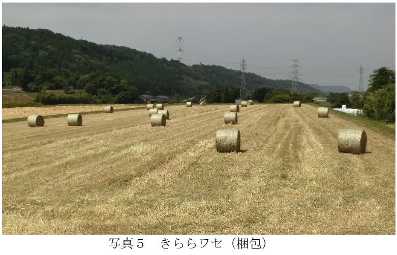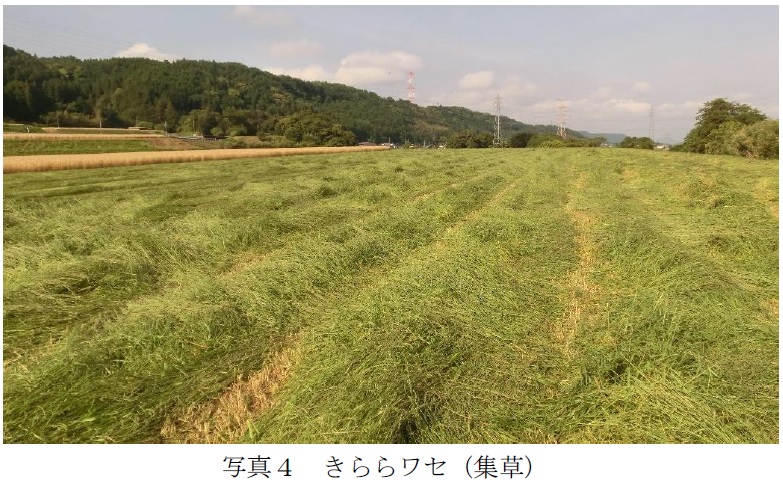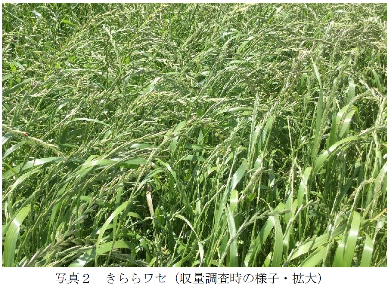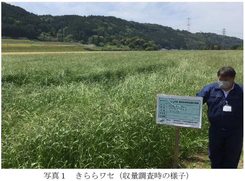 | 栽培概況 気象・生育・展示 | ・新品種を導入し展示して地域の飼料増産の普及につなげる。初期生育は良かったが、12月に気温が平年よりも低かったため、立ち枯れによる欠株で、収量が伸び悩んだ可能性が考えられた。生育は全体的におおむね良好であり、病害、害虫の発生は確認されなかった。外観として、特性どおり葉幅が広く、茎径が太い草姿が観察された(写真1及び2)。3月6日に追肥として複合肥料(N:P:K=14:14:14)を45kg/10a散布した。4月27日の収量調査日には、生育ステージとして出穂期を迎えており、平均草丈は132.9㎝であった。ロールベール体系による収穫は5月15日~17日に実施し、実収量は100㎝×100㎝サイズのロールで20個(約5個/10a)生産できた。収穫時は晴天が続いたことで、良く乾燥できた。中生品種としては茎が太いため、評価は高い。 |
