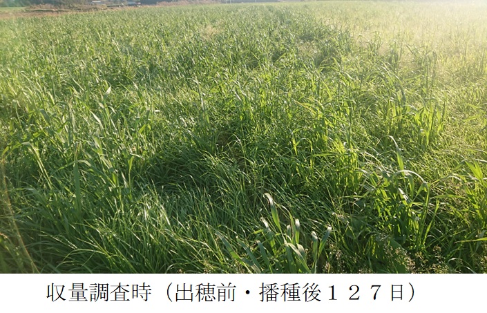 | 栽培概況 気象・生育・展示 | ・新品種の導入と展示により地域の飼料増産につなげる。播種から初期生育時の水不足により生育が不良であったものの、その後の生育は順調で、病気の発生もみられなかった。初期生育が遅かったために、当初予定していた年内収穫ができなかった。2番草の生育は順調であり、乾物収量は1番草の約1.8倍となった。 |
