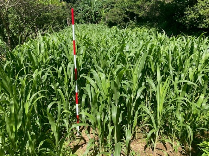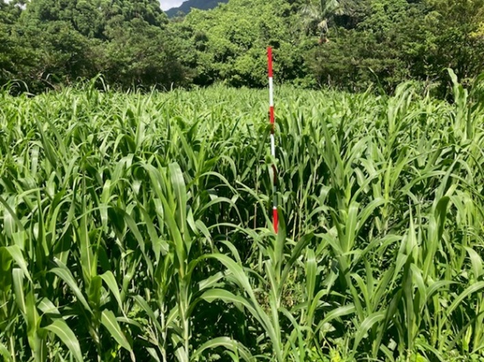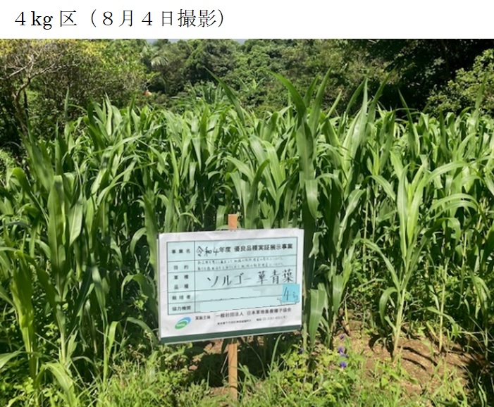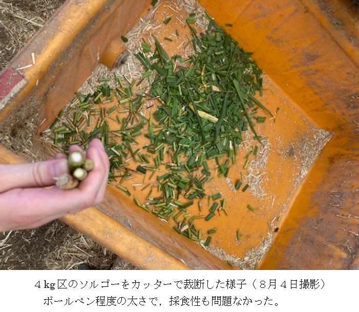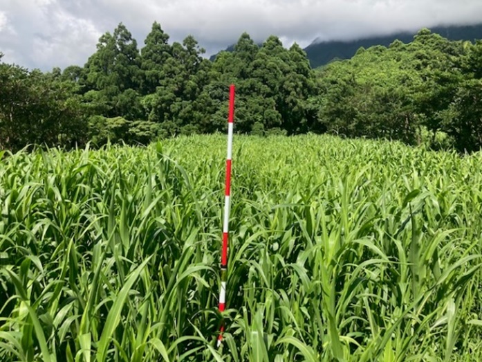 ・新品種を導入し展示して地域の飼料増産の普及につなげる。ローズグラスが主体の当地域において新たな栽培体系を取り入れて地域の飼料増産につなげる。播種遅れにより降雨の影響を受け、達観で設置面積の約4割が発芽ムラと湿害による生育不良となった。(収量は、湿害を受けていない部分で生育中庸な所を調査した。)歩行モアまたは刈払機で伐採後、軽トラに手で乗せる作業が苦労したが、自走小型ロールベーラを導入し対応した。屋久島では、飼料作物作付面積が少なく機械作業体系ではないため、省力的な作業体系を検討しないと長大作物の栽培は労力的に難しいと感じた。2番草は各区収穫後9月頃に追肥したが、生育が芳しくなかった。播種時期は4月~5月上旬までに行った方が良いと感じた。日々同じ草を食べていても飽きるだろうと思い、牛には数種類の草を与えたいので、今回華青葉を栽培してみたところ、採食性も良かった。また、収量と茎の太さを見たところ、播種量は4kg~5kgでちょうど良いと感じた。ただ、トラクターの調子が悪く播種が遅れてしまったことが悔やまれるので、来年は4月頃には播種し、生育の良い期間に栽培したい。 |