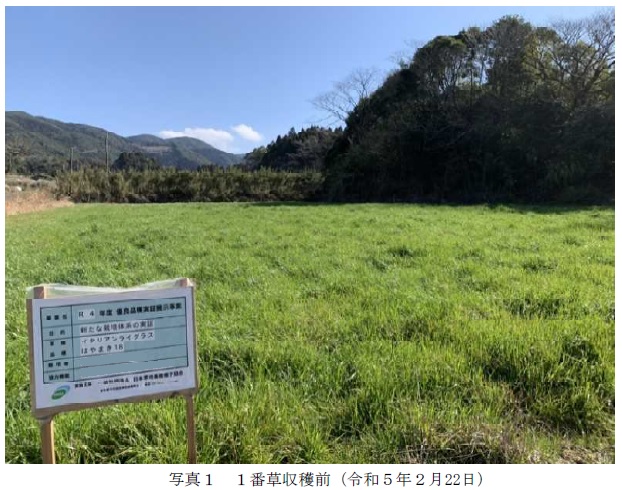 | 栽培概況 気象・生育・展示 | ・新品種を導入し展示して地域の飼料増産の普及につなげる。当地域の平均気温は平年並みであり、降水量は昨年よりやや多かった。9月下旬の播種であったが、いもち病等による生育停滞は確認されず、播種97日後の1月5日に1回目の収穫が可能であった。1月の寒波到来により平均気温が5℃を下回る日が続き、1番草刈り取り後の伸長停滞が見られたが、3月中旬以降に平均気温10℃以上が続き、伸長が顕著となった。 |