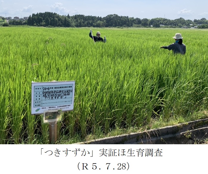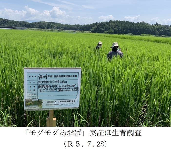 ・飼料用イネは地域の自給粗飼料として多く栽培利用されているが、従来型の飼料用イネは子実の未消化部分が多いことが原因とされる栄養損失や、糖分が少なくサイレージ発酵が進みにくいなどの課題が指摘されていた。そこで、これらの改良を目的として育種改良された極短穂型の飼料用イネ品種の栽培実証・展示を行うことで、良質粗飼料の増産につなげる。栽培期間(定植~最終調査)中の平均気温は24.8℃、積算降水量は1,477㎜で、平年より0.9℃高く、304㎜多かった。(1)出穂:5月9日の移植日から100日前後につきすずかの出穂が始まった。モグモグあおばは80日前後に出穂が始まったことから、同じ晩生でも20日程度の差があることが確認された。(2)草丈:移植後80日時点では、つきすずかの草丈は134.9㎝でモグモグあおばより5㎝程度低かったが、118日目には154.5㎝となり、モグモグあおばより15㎝程度高くなっていた。(3)径数:1株当たりの径数については、移植後118日時点では、つきすずかは約20本でモグモグあおば(12.5本)に比べ1.6倍程度と多かった(80日調査時点では1.2倍程度)。(4)収量:定植後118日時点では、生草収量5,484kg/10a(モグモグあおばの1.39倍)で乾物率36.7%、乾物収量は2,013kg/10aで、モグモグあおばの1.33倍の収量であった。乾物収量で500㎏も多かったことから、購入乾草(80円/DMkg仮定)で換算すると40,000円/10aの増収効果が期待された。また、立毛の状態で乾物率が30%を超えていたことから、ダイレクトでの収穫による良質サイレージ化も可能と推定され、出穂後に高糖分が3ヶ月程度維持される特性(日本草地畜産種子協会資料より)を考慮すると、機械作業の省力化や作業分散がしやすいなどのメリットも推測された。(5)病害:一部にごま葉枯病が見られたが、モグモグあおばより発生は少なく生育に影響がでるような病害は見られなかった。(6)その他の状況:穂長は、つきすずかが9.6㎝でモグモグあおばより12㎝ほど短かった。また、1本当たりの籾数は23.3で、モグモグあおばの10分の1程度と極短穂で茎葉発育型の特性が確認された。(7)普及性:早期水稲地帯での実証となったが、「つきすずか」は「モグモグあおば」より出穂が20日程度遅い晩生種であることから、食用早期水稲とのコンタミのリスクが少ないことや、病気の発生も少なく多収であったことから、曽於地域早期水稲地帯に適した飼料用イネ品種として有望であり普及の可能性は高い。また、草丈はモグモグあおばより高いが、籾数がモグモグあおばの10分の1と重心も低いことから、倒伏しにくい品種であることや、出穂後糖分が高い状態が続き、茎・葉が多く未消化の籾として排泄される無駄も少ないことから、利用性の高い品種として今後普及が期待される。しかし、新たな品種が地域に普及するためには、苗作り業者の理解促進と、水の管理手法やコンタミ等のリスクが少ないことなどの周知がカギになると思われる。 |