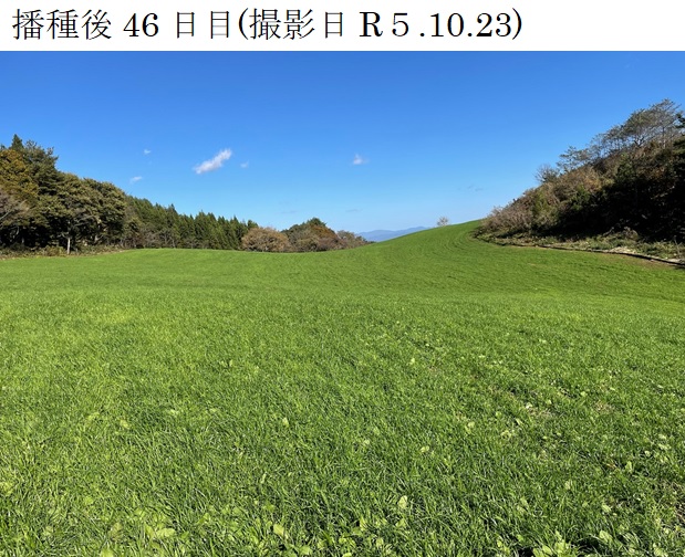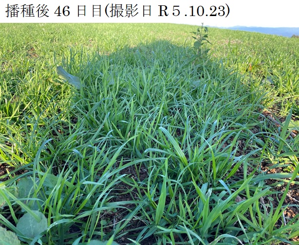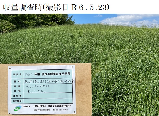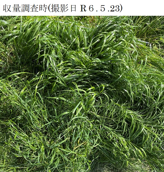 | 栽培概況 気象・生育・展示 | ・新品種を導入し展示して地域の飼料増産につなげる。完全更新による播種で、発芽及び生育は良好。令和5年10月下旬時点で10㎝程度の草丈となった。越冬後にも旺盛な発育を見せ、令和6年5月下旬の収量調査は良好な結果となった。 |