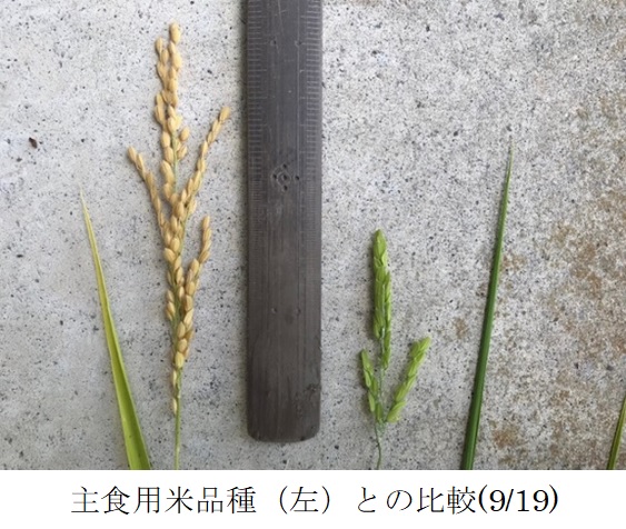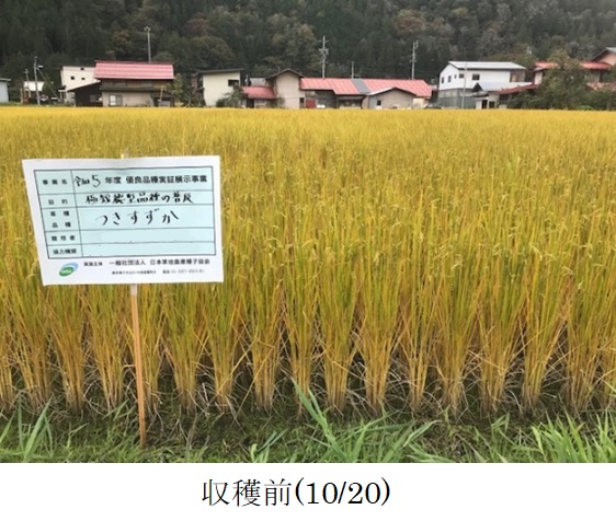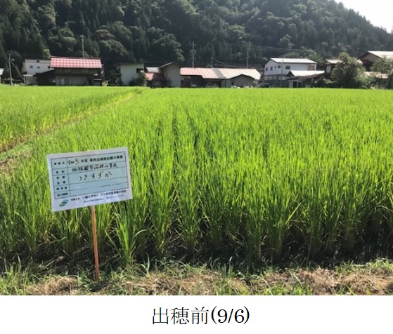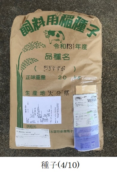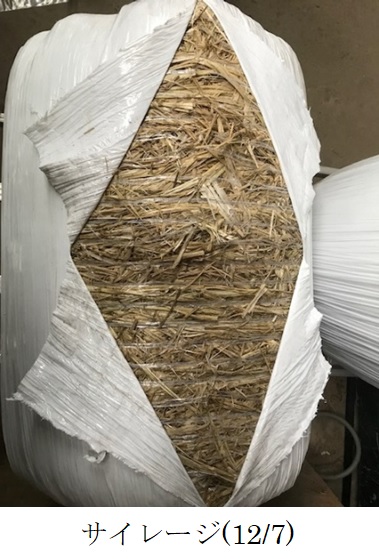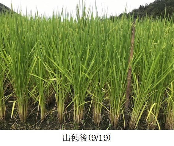 ・主食用米品種による飼料用稲の生産を主体とした地域において、サイレージの品質向上のため極短穂型茎葉品種を栽培展示した。(1)初期生育:苗は育苗期間の高温により一部でヤケが発生したが、病害はなく概ね順調に生育した。本田への活着後は、日照不足や低水温により分げつの進みが遅かった。(2)病害虫・雑草:病害虫による被害はなかった。雑草は、水はけのよい田で除草剤の効きが悪かったため、ヒエやオモダカ、ホタルイが発生した。8月1日、一時的に激しい雹が降り、茎葉が折れるなどの被害が発生した。程度は不明だが、減収に影響したと見られる。(3)生育期間中気づいた点:栽培地は高標高地(標高740m)のため登熟が十分進むか懸念されたが、収穫適期となる黄熟期に達することができた。穂長は、主食用米品種の半分程度と、品種の特徴通り短かった。同一株の中で、他の茎より20~30㎝程度長い茎が見られた。(4)収量性:基肥の窒素施用量が少なく、出穂前の雹もあったため、令和2年に行われた試験の収量(4,090kg/10a(乾物1,440kg/10a))より少なかった。しかし、県の飼料作物栽培基準の目標収量(2,500kg/10a(乾物1,200kg/10a))より多かった。堆肥を連用しているほ場で、地力が高かったためと推測される。(5)今後の使用の可能性や普及性:収量が多く倒伏しにくいため栽培しやすく、今後地域で使用する可能性がある。晩生品種のため、地域で作付される主食用米品種と作期を分散する選択肢にもなる。今後普及する際には、適切な施肥量や作型を把握するとともに、サイレージの品質を調査し高品質なサイレージが生産できるよう、栽培及び収穫の方法を確立することが課題となる。 |