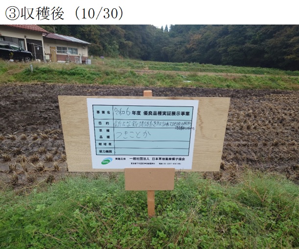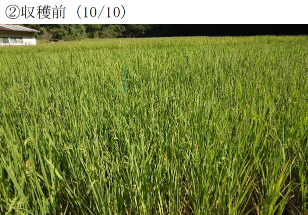 | 栽培概況 気象・生育・展示 | ・新たな栽培体系(組合せ)を取り入れて地域の飼料増産に繋げる。初期生育(田植え後30日)は、他の短穂性品種と同程度であったが、田植後60日以降に旺盛な生育となり、収穫前に草丈は150㎝前後となった。既存品種より田植え時期は30日遅くすることができたため、田植え作業の分散は達成できた。収量性は非常に良かったが、8月中旬以降に、圃場の一部日当たりの悪い箇所でいもち病が発生した。今後、地域への普及を行う場合、いもち病の発生を考慮した作付圃場の選定が必要である。 |