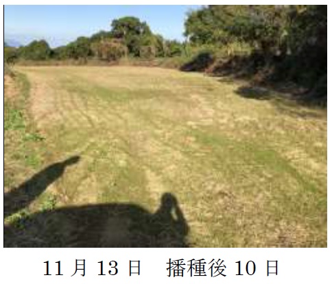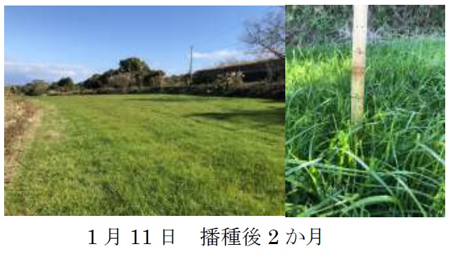| 栽培概況 気象・生育・展示 | ・新品種を導入し展示して地域の飼料増産の普及につなげる。発芽がまばらであり、初期生育は不良であった。発芽や生育が乏しい箇所はノハラツメクサ等の雑草が繁茂したことによる影響が大きいと考えられる。その後雑草防除等は行っておらず、生育状況は不良であった。収量調査時の平均草丈が70.3㎝(37~119㎝)、乾物収量は977kg/10aであった。 |