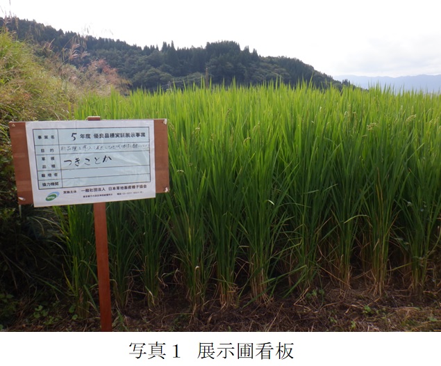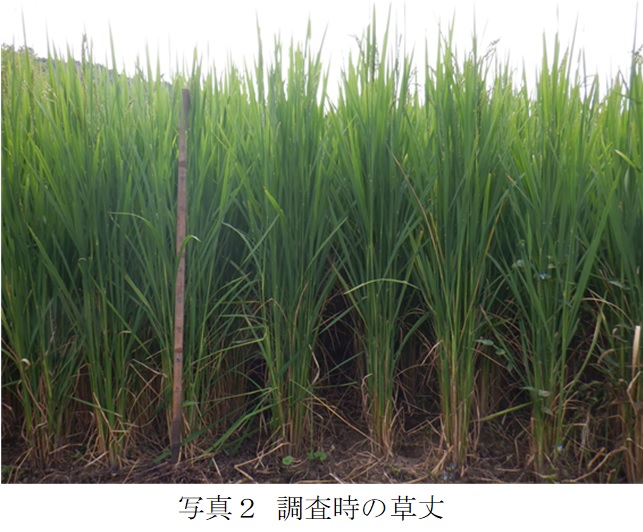 | 栽培概況 気象・生育・展示 | ・地域の飼料増産のために新品種の導入の可能性を検討。初期生育は旺盛で順調に生育しており、調査時の草丈は173㎝と非常に高い草丈であった。病害虫の発生による被害は無く、また倒伏も無かった。普及の可能性はあると考えられるが、次年度以降も調査して年度間差を調べる必要がある。 |
