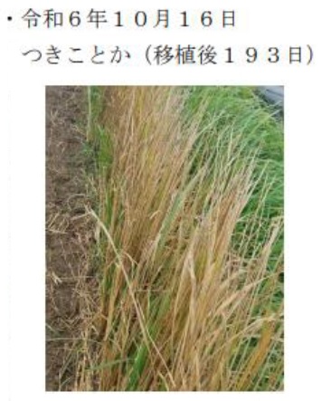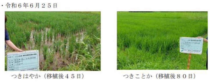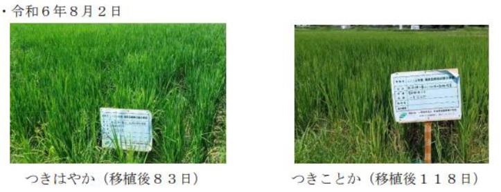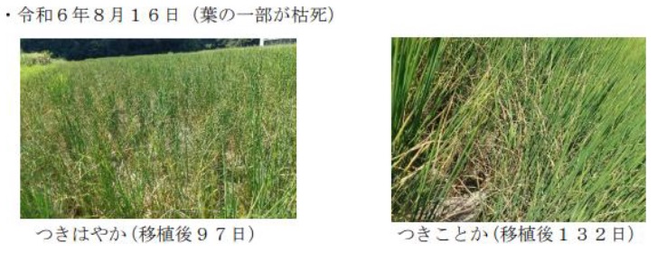 | 栽培概況 気象・生育・展示 | ・新品種を導入し展示して地域の飼料増産の普及につなげる。「つきはやか」は一部スクリミンゴガイによる食害を受けたものの、両品種ともに初期生育は良好であり、倒伏も見られなかった。収量調査について、「つきはやか」は出穂始め、「つきことか」は出穂前に行った。生草収量、乾物収量ともに、「つきはやか」よりも「つきことか」で多かった。両品種とも、8月16日時点で一部の葉に枯死が認められ、特に「つきはやか」での枯死が激しかった。「つきはやか」について、8月2日の収量調査以降、出穂が進まなかった。また、「つきことか」についても生育状況の確認を続けたものの、ほぼ未出穂のままで、10月16日に立枯れを確認した。本年は例年と比較し、7月から8月中旬までの降水量が少なかったことから、水不足のため葉の枯死及び生育停滞が起こったものと思われる。「つきことか」については、水不足に加え、肥料切れの可能性も考えられる。 |