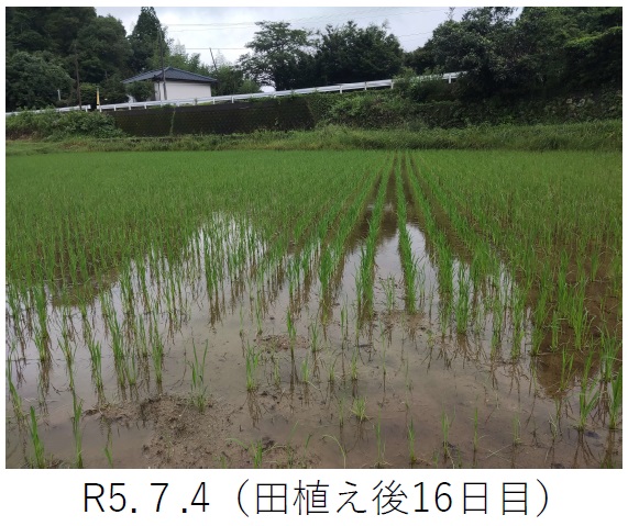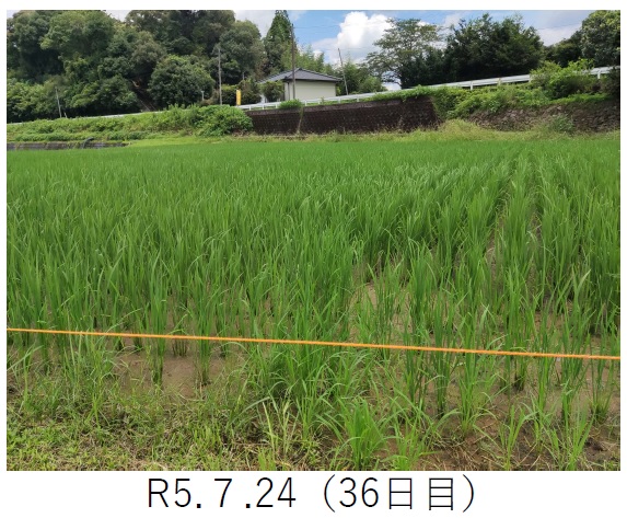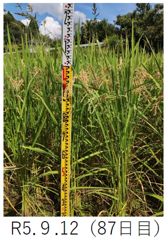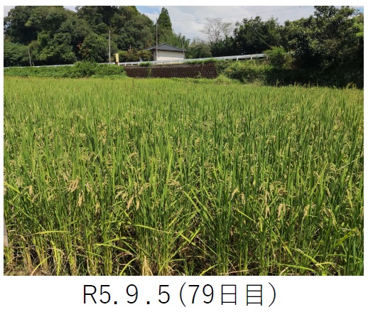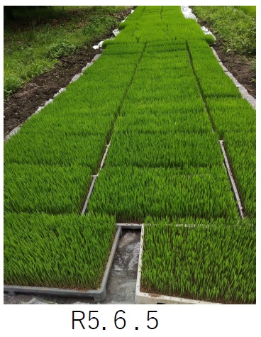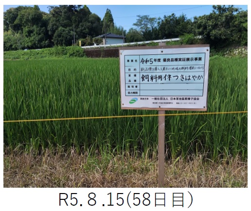 | 栽培概況 気象・生育・展示 | ・新品種を展示して地域の飼料増産の普及につなげる。初期生育は良好な生育を示した。収量確保を目的に30×15(㎝)(畝幅×株間)と密度を高めて田植えを行ったが、分けつ数が少なく収量増は認められなかった。病害虫や倒伏は見られなかった。今回の品種は薩摩川内市のWCS収穫体系には適しているが、多収を求める場合は中晩生の品種についても実証が必要である。意見としては、種子単価が高額な点である。 |