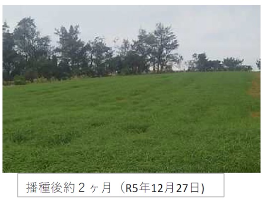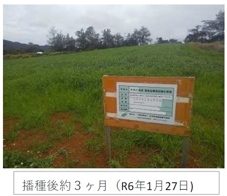 | 栽培概況 気象・生育・展示 | ・新品種を導入し展示して地域の飼料増産の普及につなげる。令和5年は10月から11月にかけて少雨傾向で降水量が平年に比し少なかった。また、高温傾向であった。10月20日に播種したが、少雨のため発芽揃いも悪かった。播種後約1ヶ月でも発芽が揃わない状況であった。その後の降雨で生育したものの、生育は遅れ気味であった。1月19日に出穂を確認した。刈取時には倒伏は無く収量性は良かった。使用の可能性や普及性については再生状況を含め検討したい。再生草は、刈取日から46日後の3月28日に調査した。出穂は3月上旬頃出穂始めとなり出穂期での調査となった。倒伏は見られなかった。量は少ないものの出穂が早く、冬季に粗飼料の不足する農家では利用の見込はあると考えられる。 |